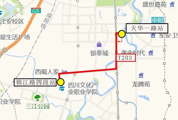 T204路优化调整后线路走向示意图原标题:《线路优化调整:可刷次卡,直通天府三街》