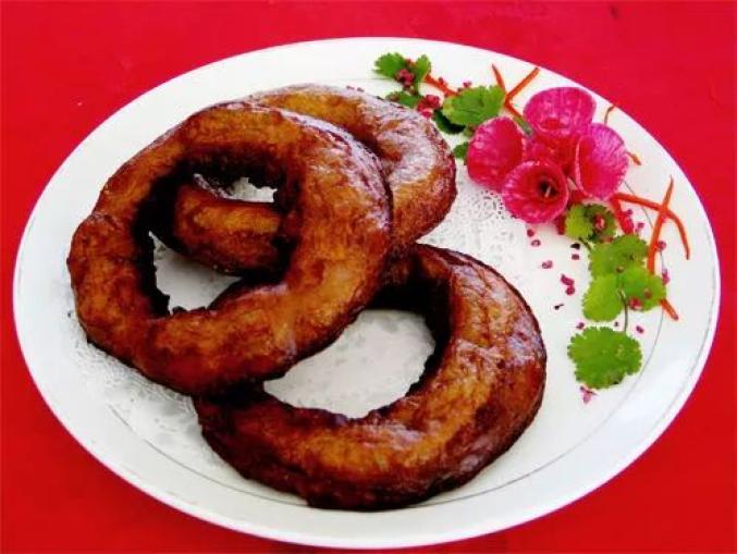 通渭荞圈圈细腻可人,以开水烫荞麦面,拌小苏打,调成糊状,旋入特制的木勺,再浸入沸油锅炸制而成。其形如镯环,色如蟹肉,味带天然之香甜,清香可口,让人垂涎,咀嚼时别有风味。