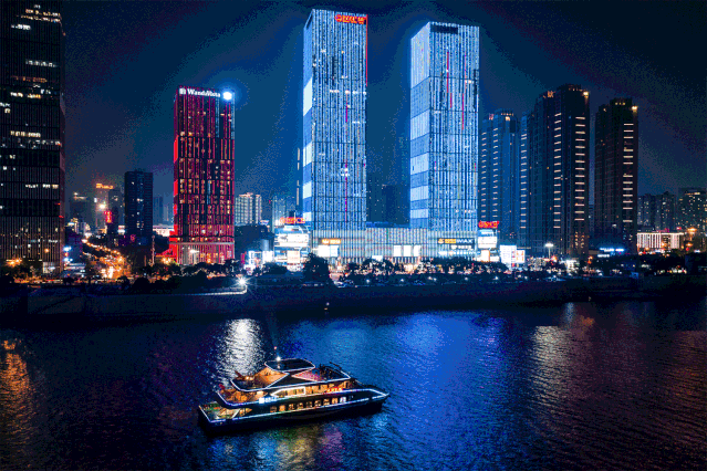 晚上的橘子洲更美。晚饭过后,散步至橘洲乘船看夜景,绕湘江黄金游道一圈,将长沙的山、水、洲、城一览无余。