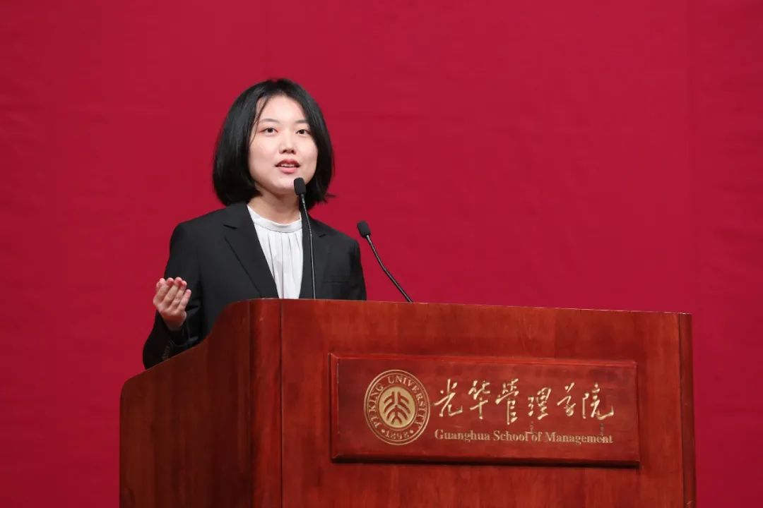 学术研究生新生代表承子珺“愿望与责任。”2021级学术研究生新生代表承子珺分享了她踏进学术殿堂的心路历程。读博之前,她不断追问自己选择学术的初心是什么?于是她回顾了此前田野调查的经历,她认为“愿望”和“责任”就是答案。她表示,每一位青年学子都寄托着家庭的期待,而作为有志于学术的北大光华人,则要敢于背负时代的责任,将时代的大问题纳入自己的思考,做贴近中国现实,有利于家国百姓的研究。她希望与同学们共同求索,并肩而行。