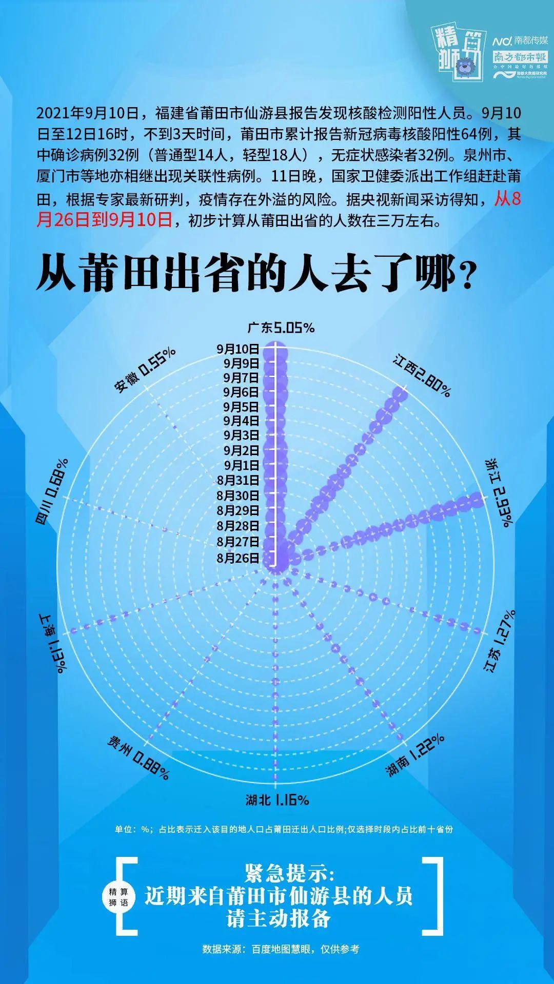 图片来源:南都大数据研究院其中,迁往广东地区的人口相比其他省份略高,9月2日,莆田迁入广东的人口规模在当日莆田迁出人口总规模中占比约为5.19%,为16天内最高占比。其次是江西省,8月26日莆田迁往江西的人口占比为16天内最高,占当日莆田迁出人口总规模的3.35%。
