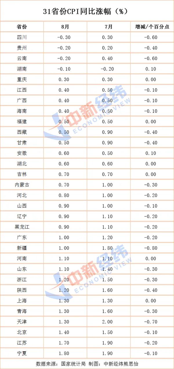 图片来源:中新经纬对比7月,天津、甘肃、陕西等20省份CPI同比涨幅有所回落,云南、四川、贵州3省份CPI同比涨幅甚至“由正转负”,重庆、福建、湖北等6省份8月CPI同比涨幅与7月持平。