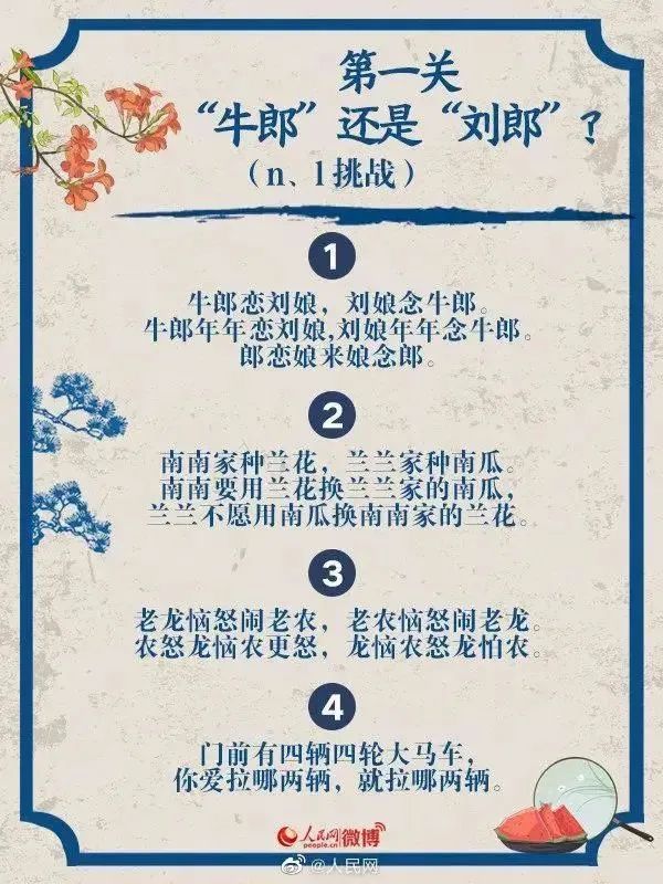 第一关主要是考验大家是否能准确地区分普通话中的声母n、l。容易被这一关绕口令难住的人们主要集中在长江流域一带及长江以南地区,如贵州、湖南、湖北等。具体来说,n、l不分的现象主要出现在西南官话、湘语、赣语、江淮官话、徽语、闽语、粤语以及少部分中原官话中。普通话