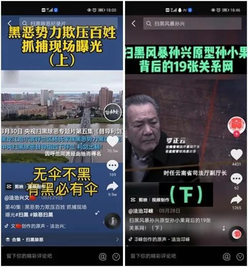 直击天津扫黑第一案、恶势力团伙落网记、命案背后、婚恋陷阱……“法治兴文”根据扫黑除恶、法治热点以及热播影视剧,剪辑制作系列短视频。网友在评论区讨论案情、法律,取得了很好的法制宣传效果。“法治邛崃”扫黑除恶、吴谢宇弑母案等热点,同时也关注建军节、奥运会等重要节点,制作正能量短视频,也增强了互动性。