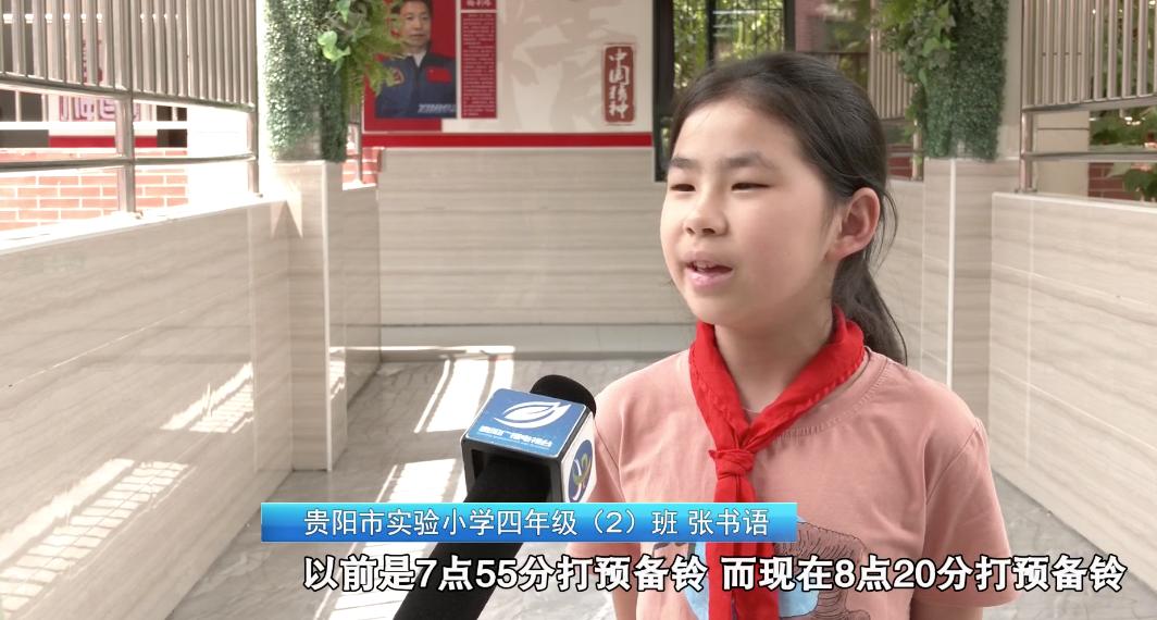 贵阳市实验小学四年级(2)班 张书语:以前是7点55打预备铃,而现在8点20打预备铃。下午以前是5点放学,现在实行托管,如果要进行托管,则是5点30放学,不托管4点就可以走了。