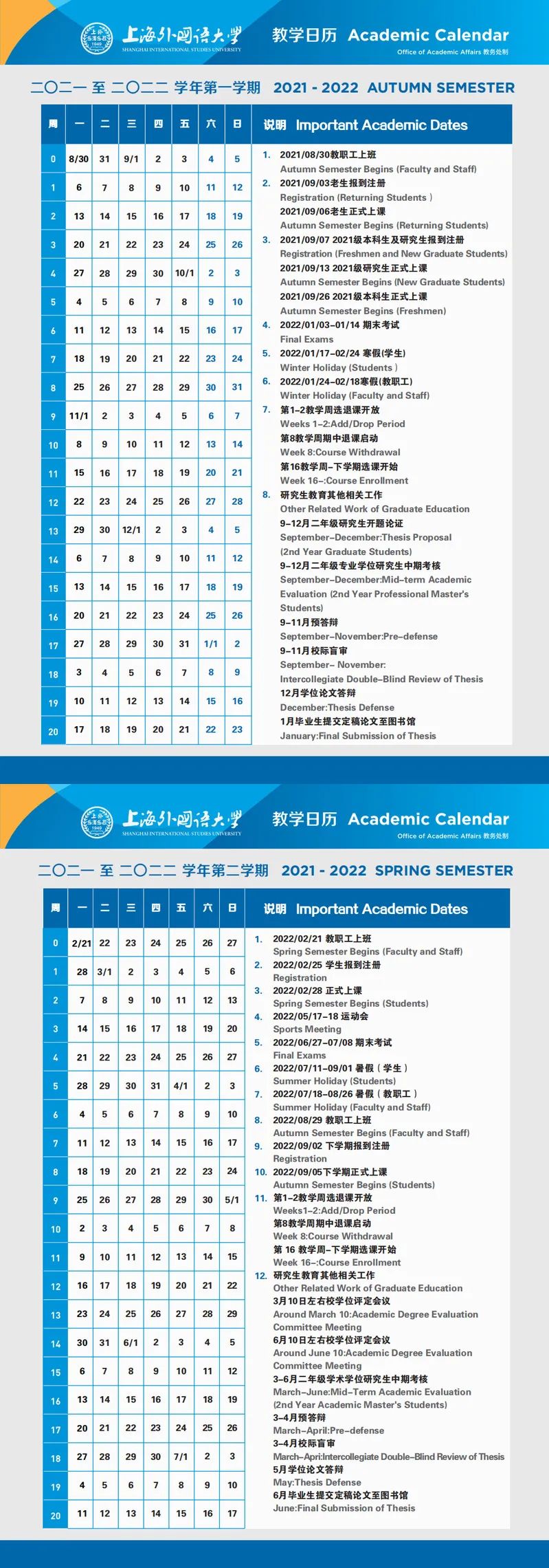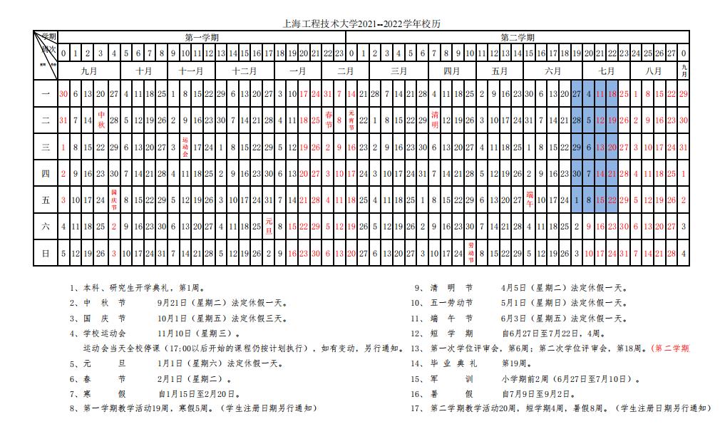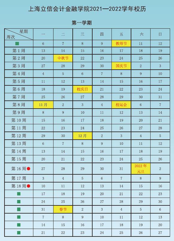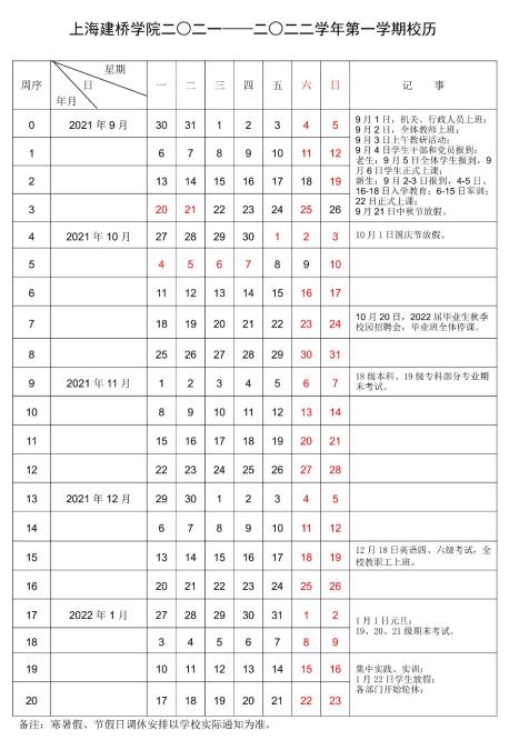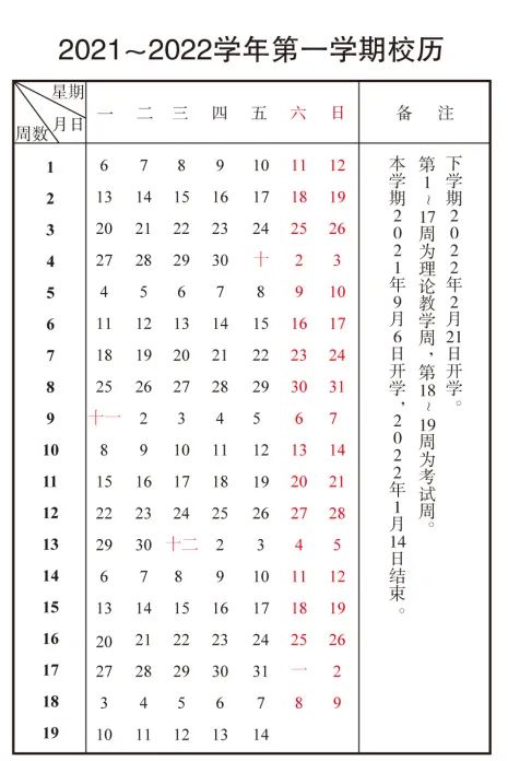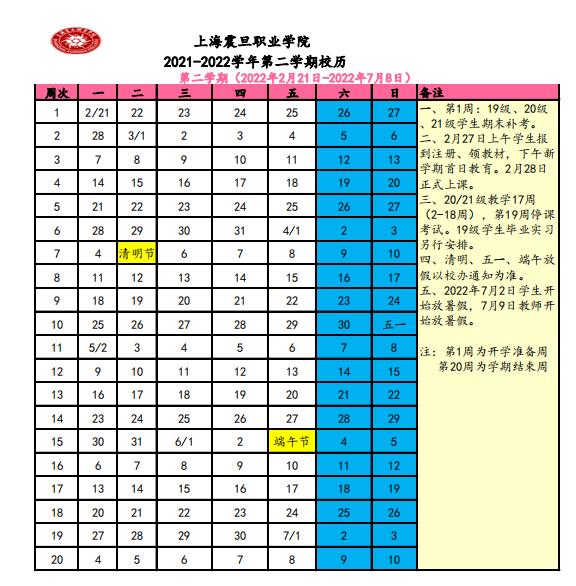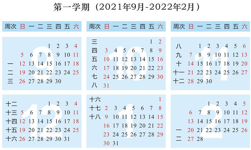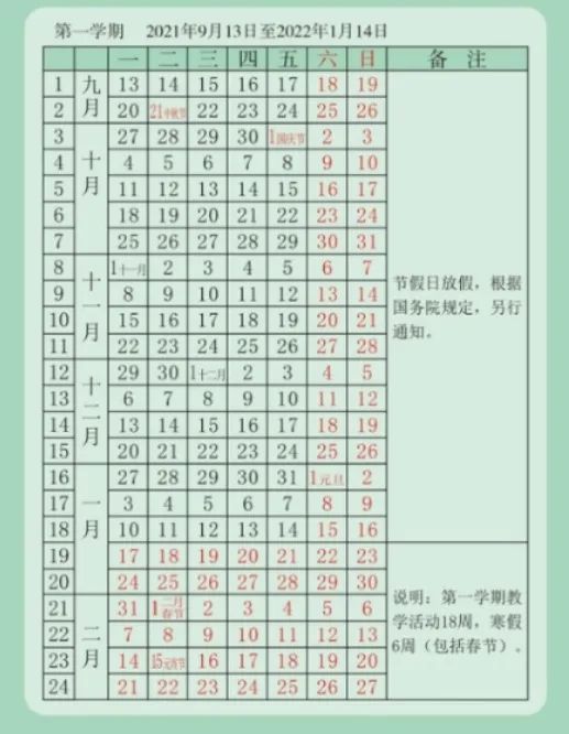 全学期共21周,2022年1月19日结束。寒假从2022年1月20日开始,2月16日结束。