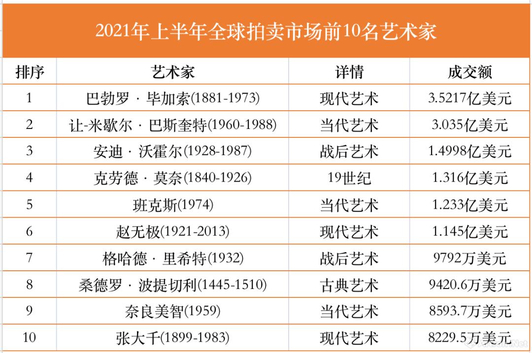 同样的,传统艺术家在拍场上的较量仍然是激烈的。《报告》给出了2021年上半年全球拍卖市场前10名艺术家,神秘的班克斯在2021上半年度以1.32亿美元的成交额,成为全球最卖座的在世艺术家。仅次于艺术巨匠巴勃罗·毕加索、涂鸦天才让·米歇尔·巴斯奎特、波谱领袖安迪·沃霍尔和印象派大师克劳德·莫奈。
