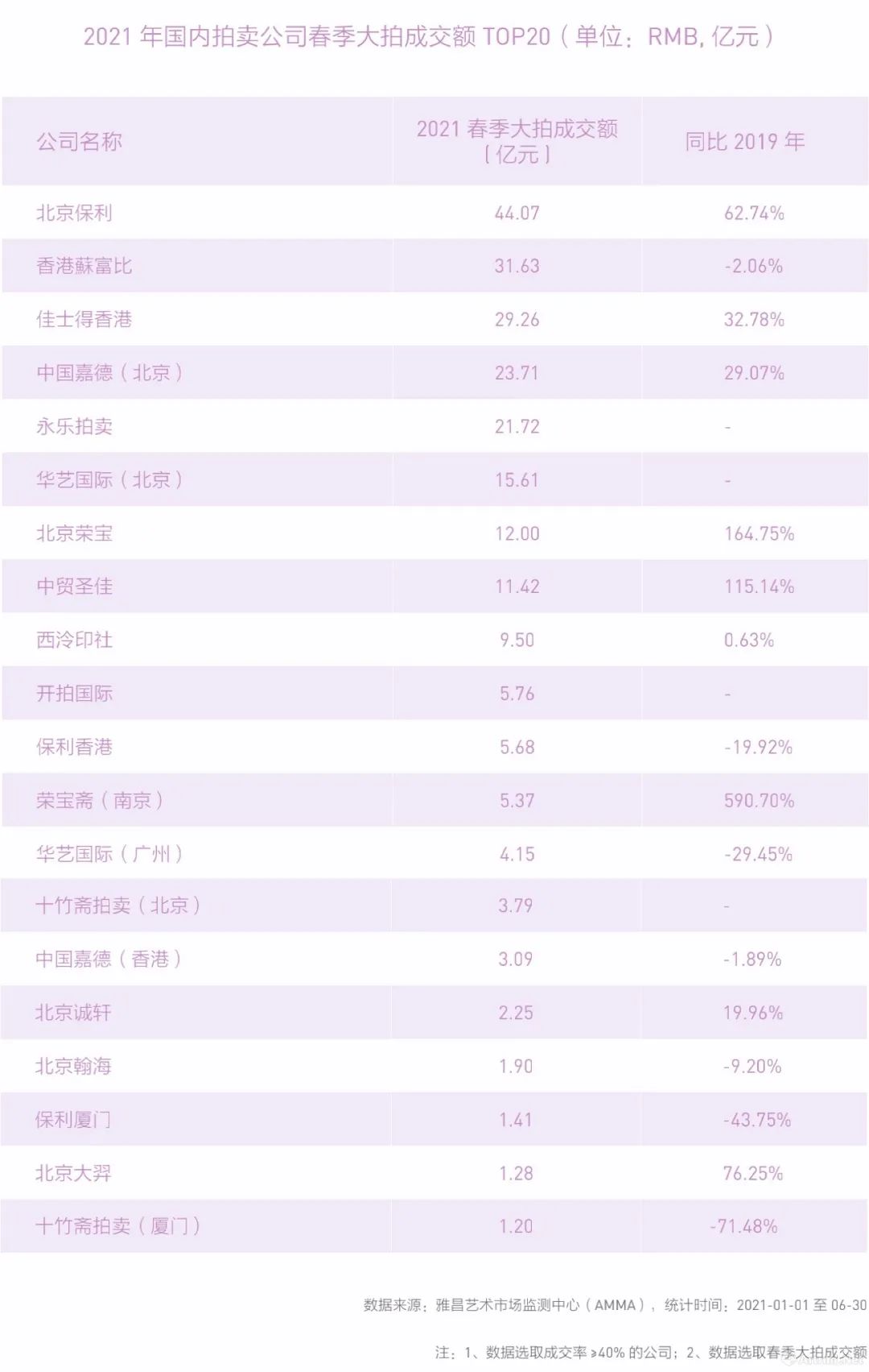 《报告》给出了2021上半年各大排行成绩排行榜,明显分为两个阵营,一方是榜单上的“老面孔”,如香港蘇富比、佳士得香港、中国嘉德、北京保利等,另一方是近几年才冲入榜单的拍企,如永乐拍卖、华艺国际(北京)、十竹斋拍卖(北京)、北京大羿等,拍企实力打榜,重建新格局。