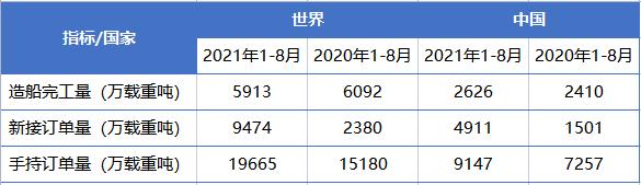 根据中国船舶工业行业协会的统计,今年1-8月,全球造船完工量、新接订单量分别为5913万载重吨、9474万载重吨、8月底手持订单量为19665万载重吨,同比来看,造船完工量小幅下降,新接订单量增长298.1%,8月底手持订单量增幅为29.5%。