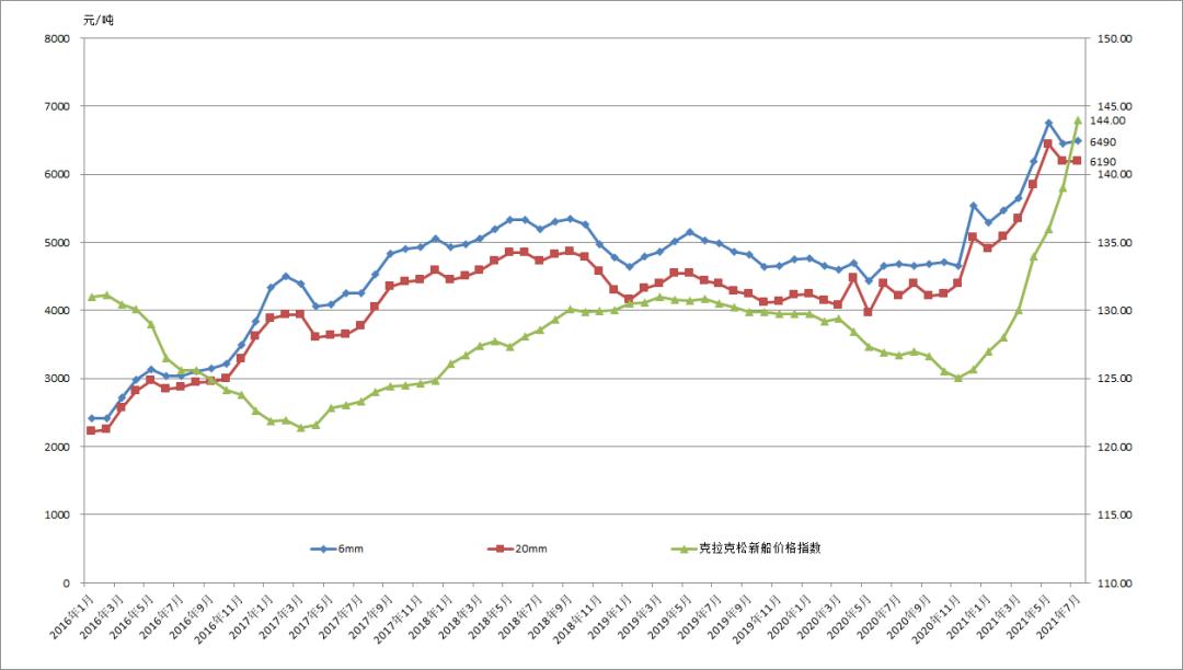 2016-2021年我国主要造船板和新船价格走势图