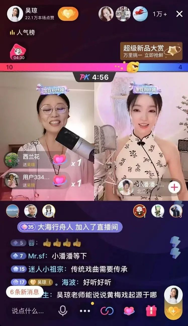 9月17日晚,吴琼在抖音开了直播间进行黄梅戏教学。在直播过程中,小潘潘与吴琼连麦,在超过一万名观众的见证下,吴琼给小潘潘讲述了《女驸马》的故事,并且为小潘潘做了演唱示范。具有魔幻现实色彩的是,作为一种“礼尚往来”,小潘潘还与吴琼合唱了《学猫叫》。