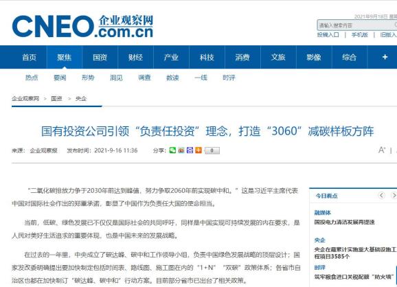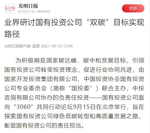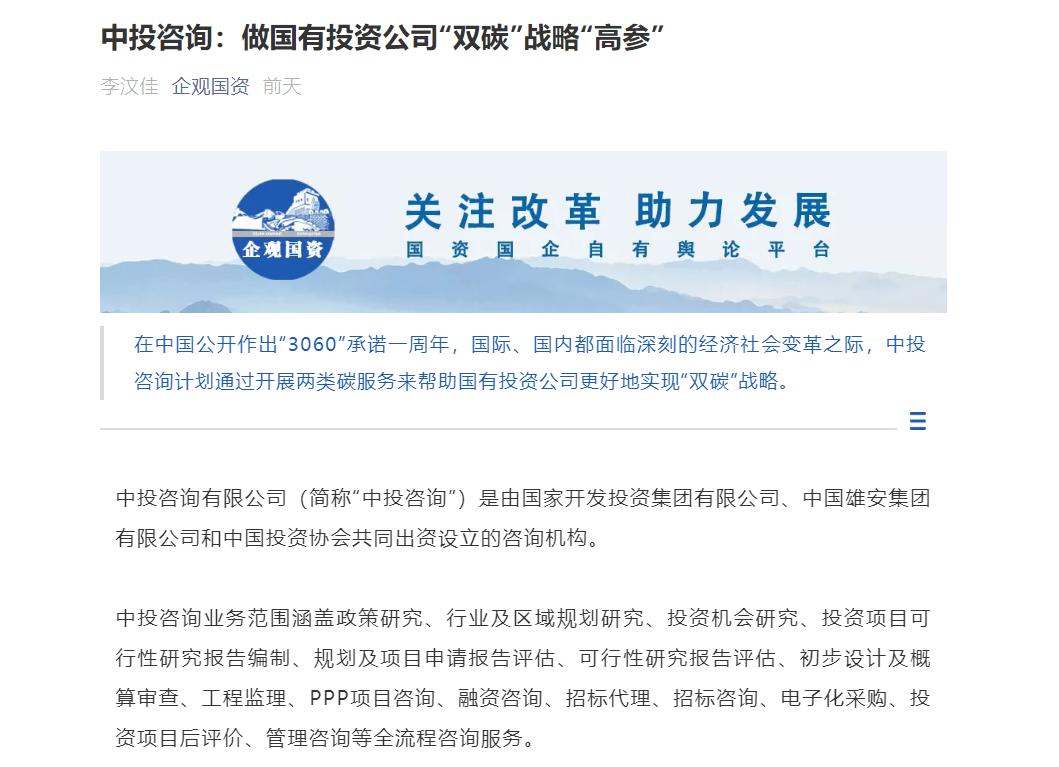 目前,国有投资公司主要投向的能源、矿产、交通、基建等几大产业恰好都是碳排放“大户”。从过去各家公司发布的社会责任报告来看,与“双碳”相关的内容重点涉及的正是上述产业。为此,中投咨询希望通过构建国有投资公司综合性的碳评价指标体系,让国有投资公司各个板块能够相互协同,为其未来开展“双碳”行动提供数据参考。中投咨询将借鉴过往实施“一带一路”项目评估时的成功经验,结合国投及其它90来家会员单位的数据支持,逐步形成可量化、可评价、能操作的科学指标体系。原标题:《“3060”共同行动亮点吸睛,这些报道刷屏了!》