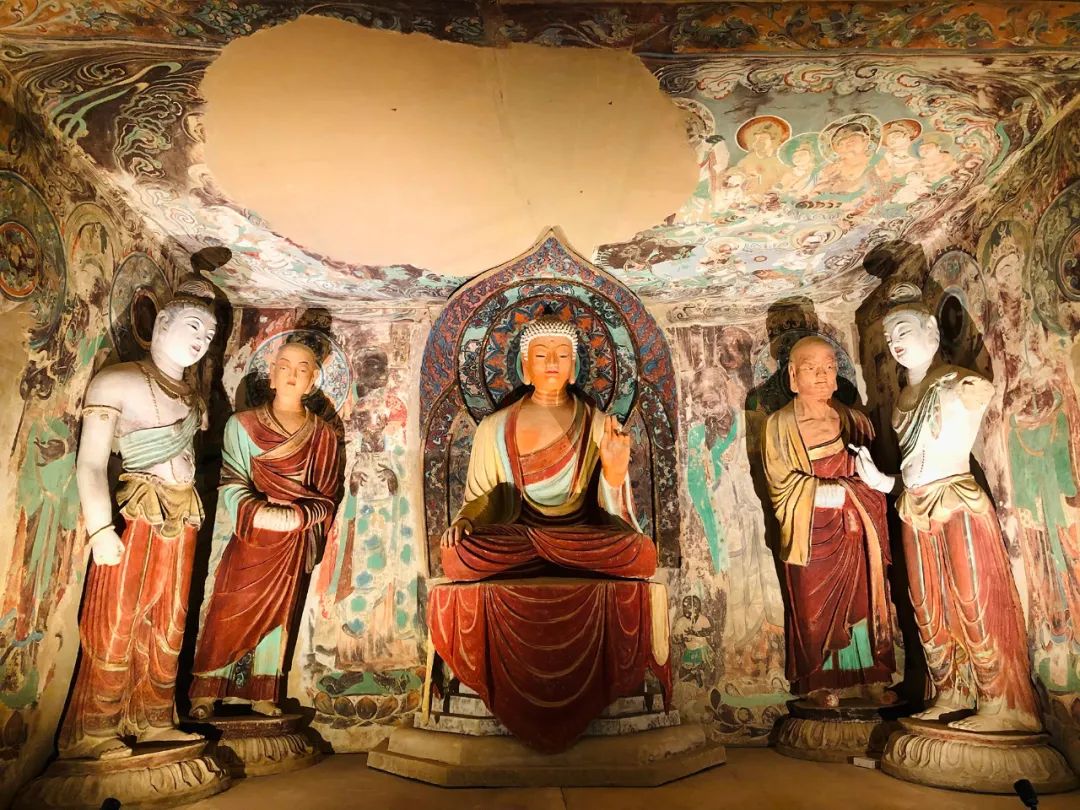 本窟的主室是覆斗形的顶,壁上有一龛,内塑一佛二弟子二菩萨。