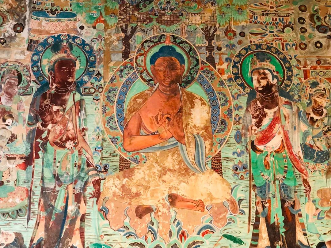 龛对面的墙壁上绘“三佛说法图”,这是其中局部。