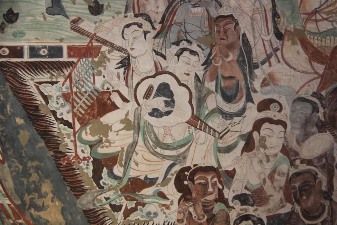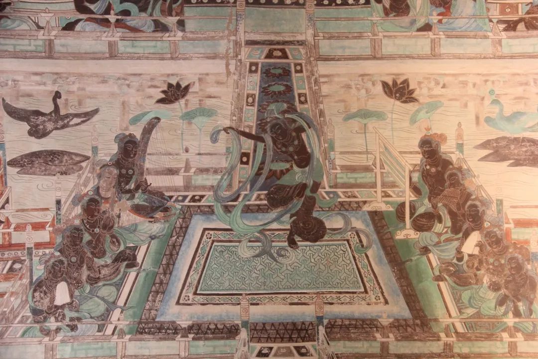 莫高窟第220窟 胡旋舞药师变中之两幅“对舞”(不少学者目之为“胡旋舞”)及其乐队,是研究乐舞的宝贵资料。