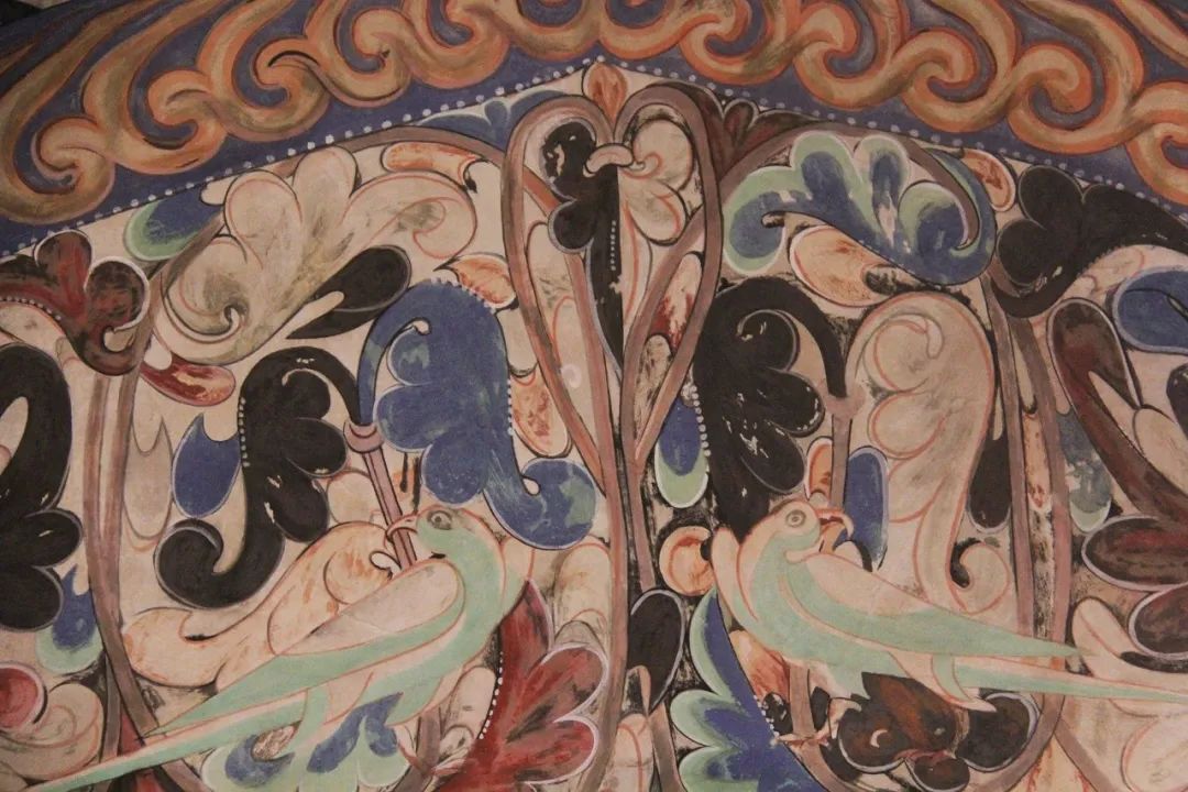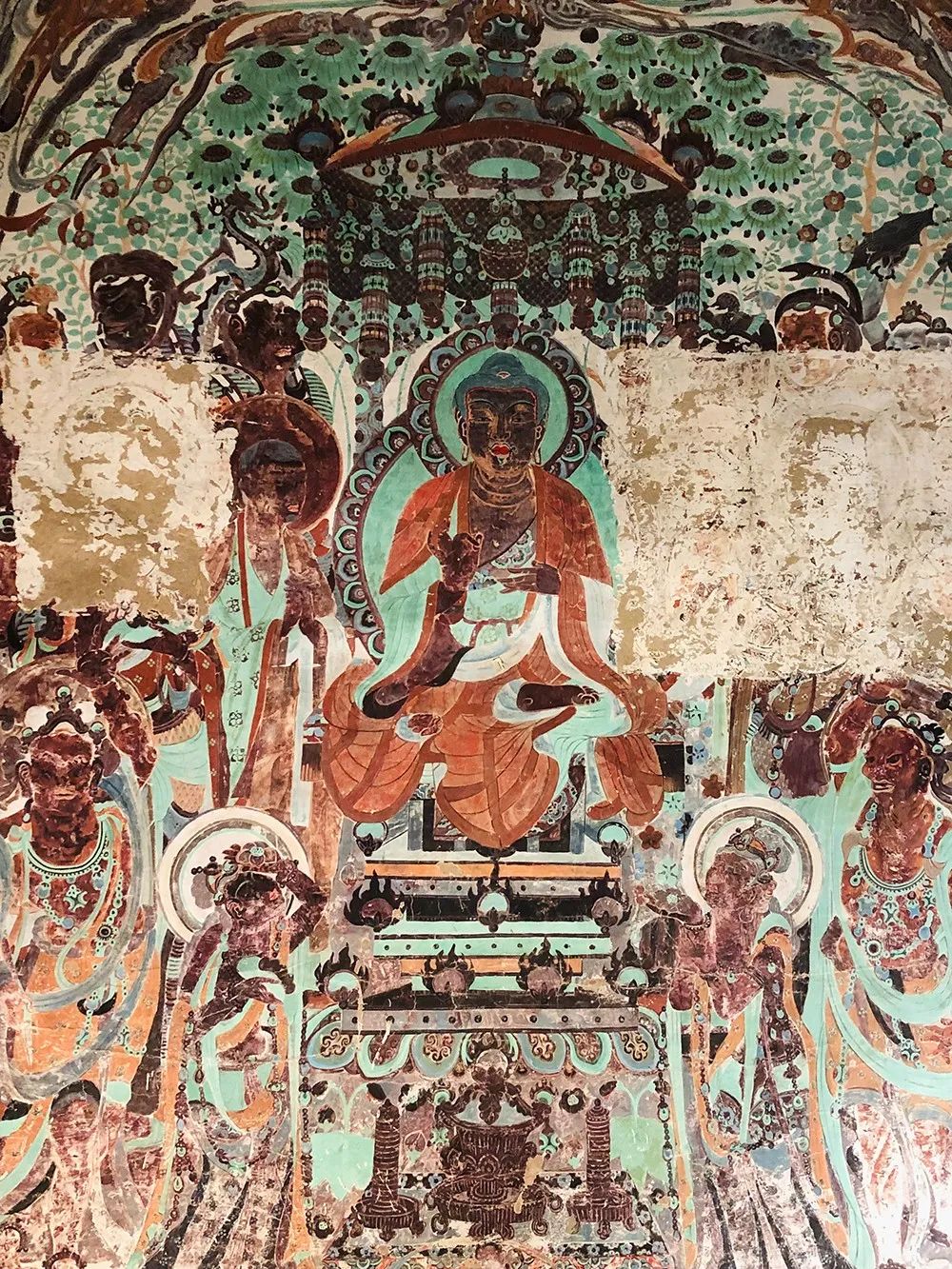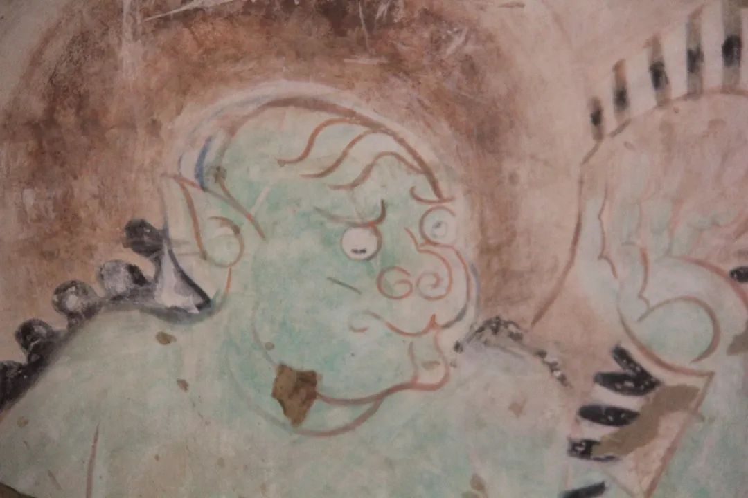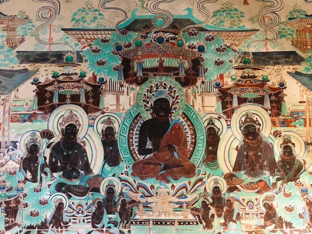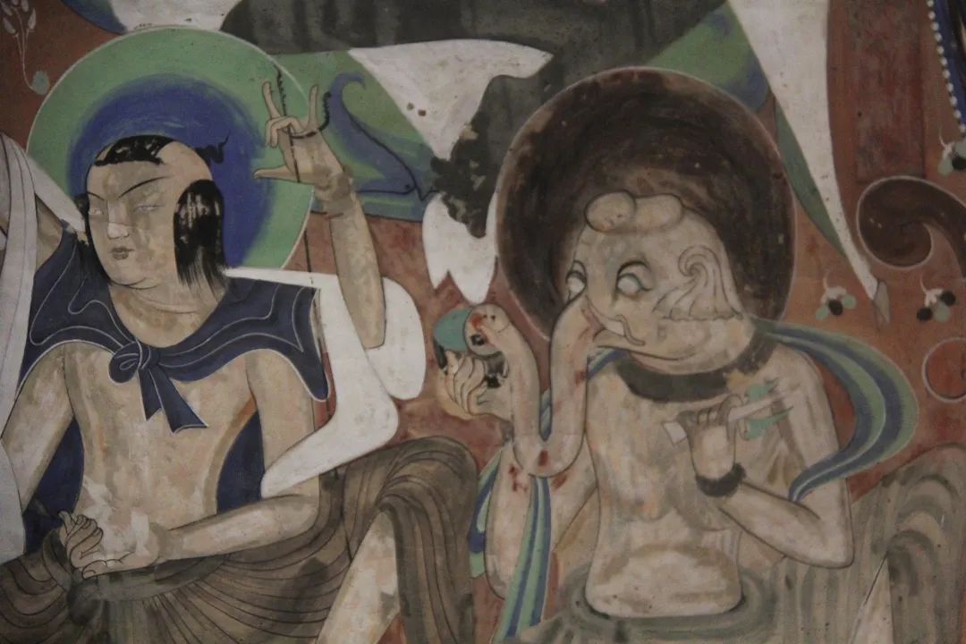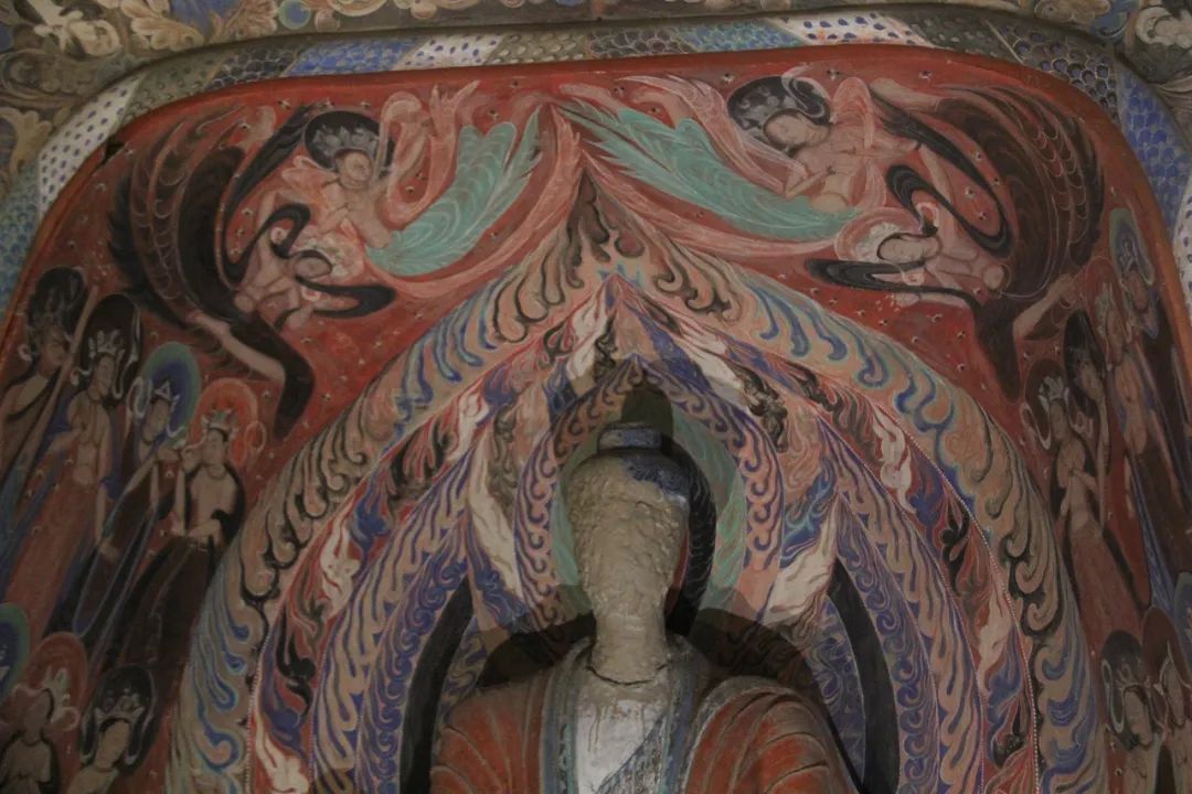 旁边墙上画千佛中央释迦说法图,其中就在1924年被美国人华尔纳盗劫两方。