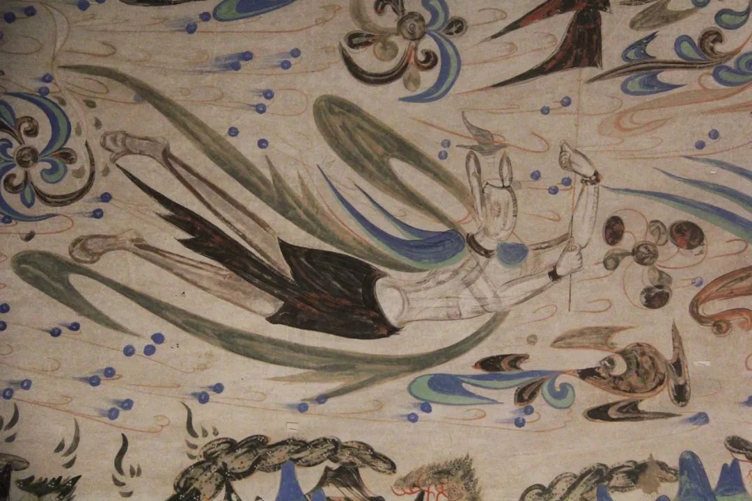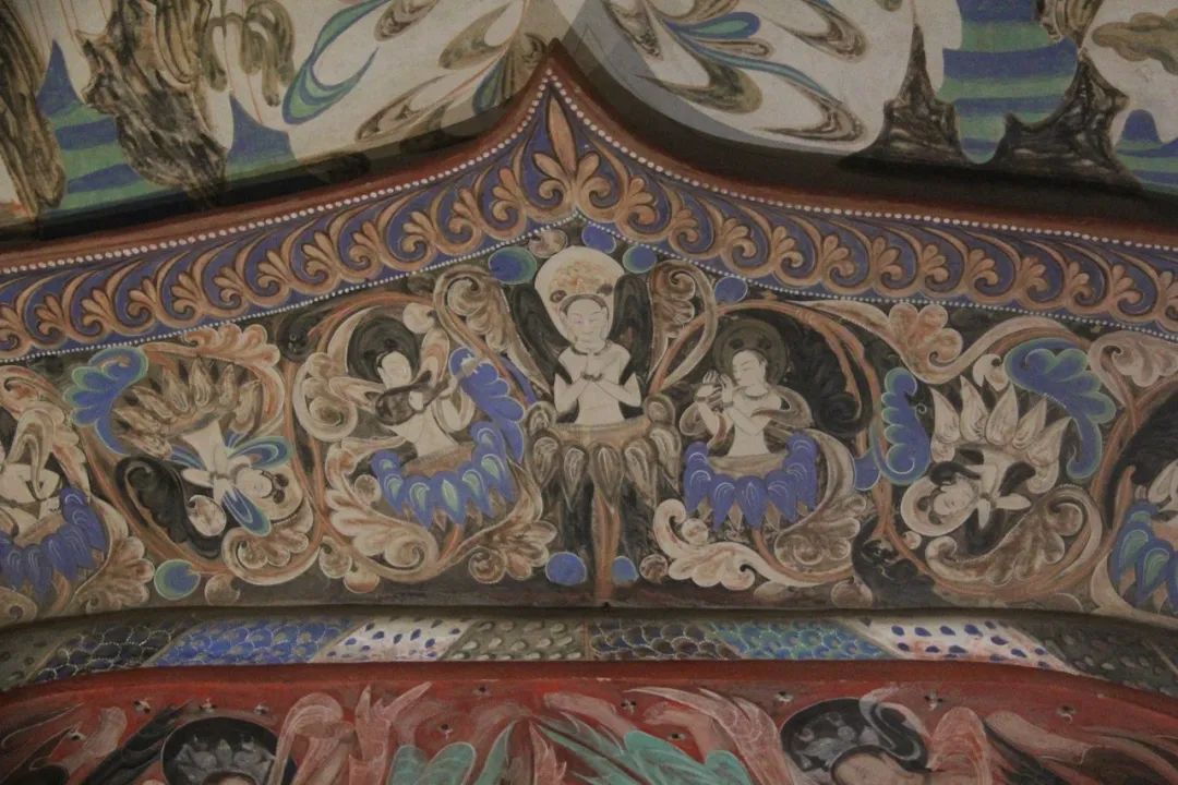 285窟开凿于西魏时期,是敦煌石窟中最早有确切开凿年代的洞窟。这面墙的壁画丰富,上半部画诸天外道形象,有日天、月天及供养菩萨等,下部画的则是四天王、婆薮仙等,最下部画的是忍冬纹边饰南壁分上、中、下三段。