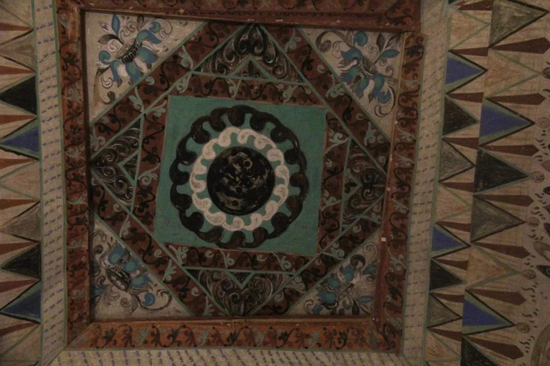 窟顶中心方井画华盖式藻井,藻井画斗四莲花井心。井心画垂莲和火焰、忍冬、云气纹;井外四周饰垂幔、彩铃。▼320窟