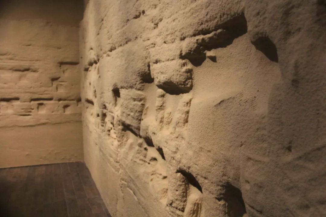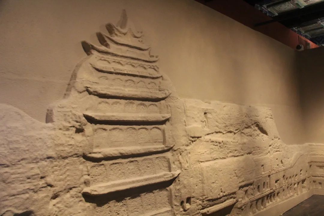 展览入口设计了敦煌莫高窟的浮雕效果尤其是用写实浮雕的方法还原了敦煌莫高窟北区崖体,观众进入展厅序厅就有一种强烈的代入感,建立起对敦煌莫高窟的初步体验。