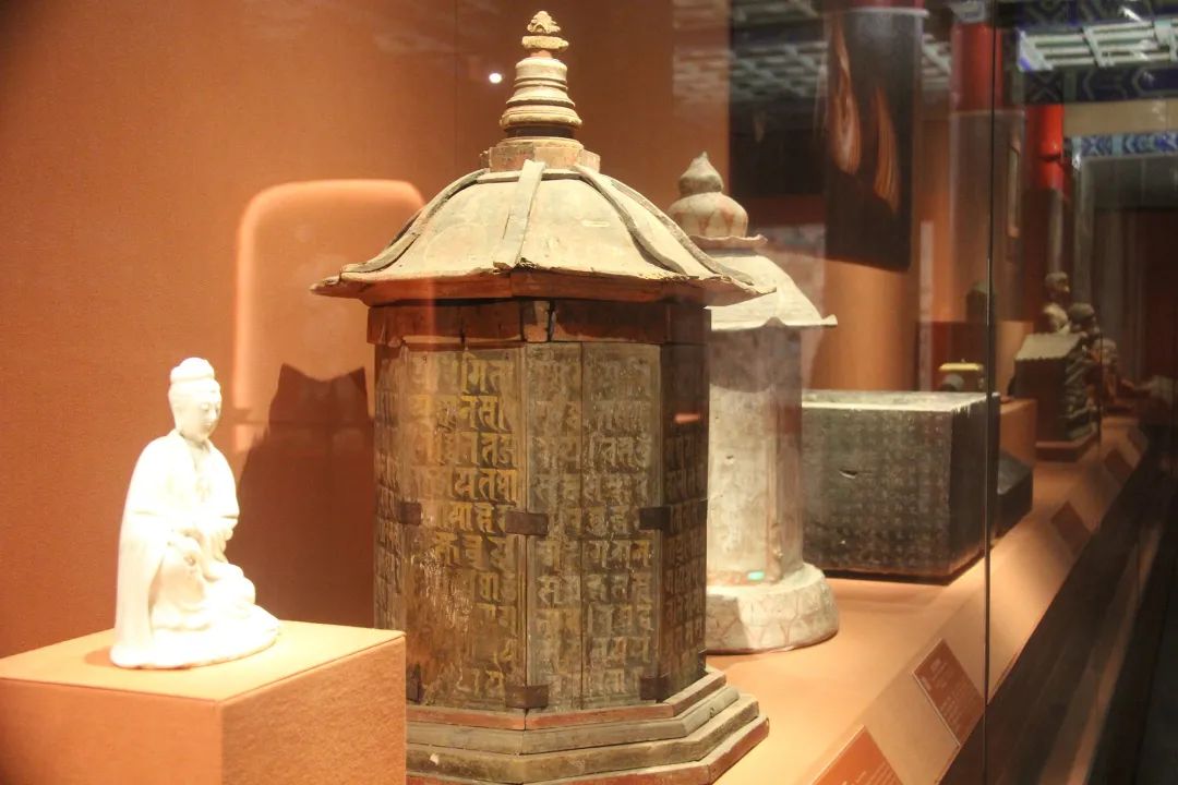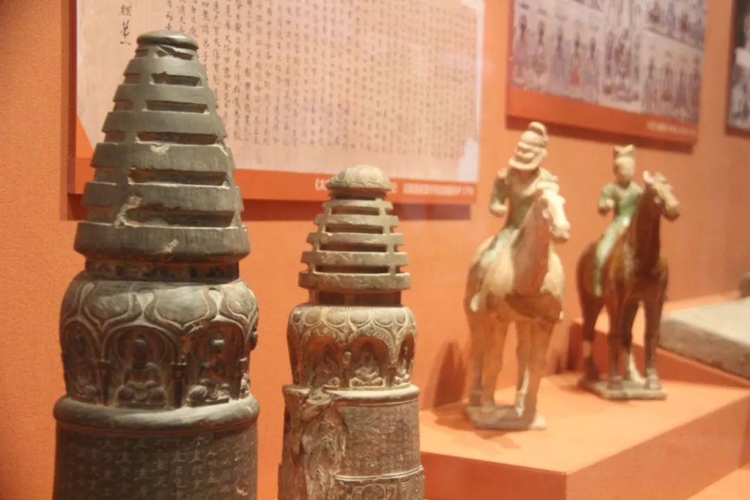 左侧文物为:高善穆石造像塔(北凉承玄元年公元428年),塔上半部由圆形宝顶、七层相轮和圆形覆钵组成,采用印度佛塔样式,开创了中国特有的八面佛塔先河,是最早的八卦实物资料之一。