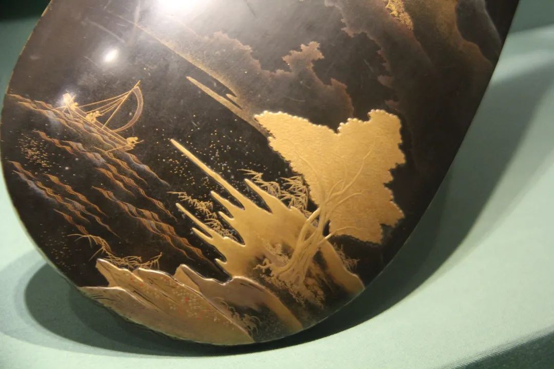 黑漆描金山水人物纹琵琶局部