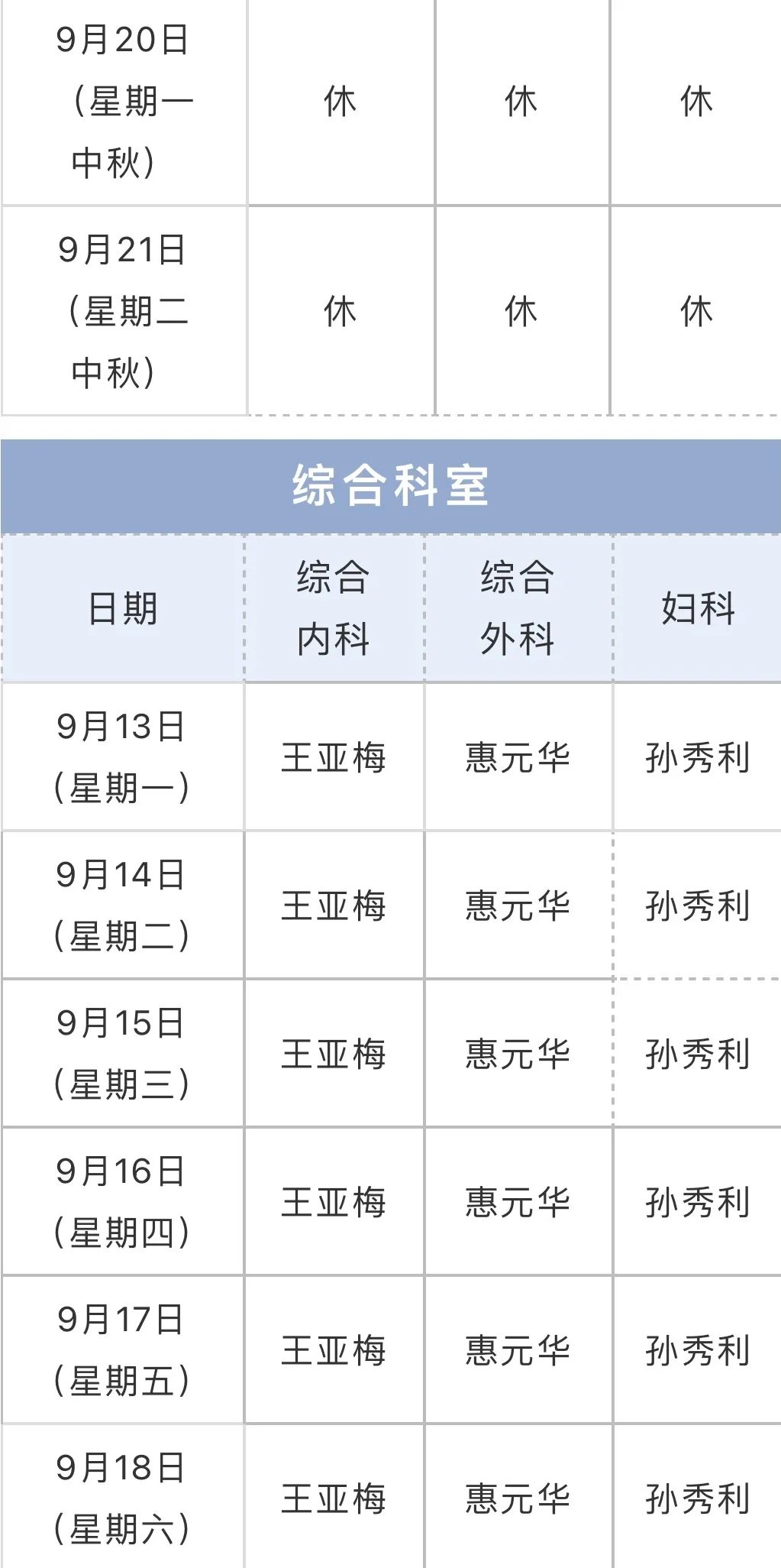 西安市中心医院2021年中秋节门诊医师排班表(9月19日——9月21日)