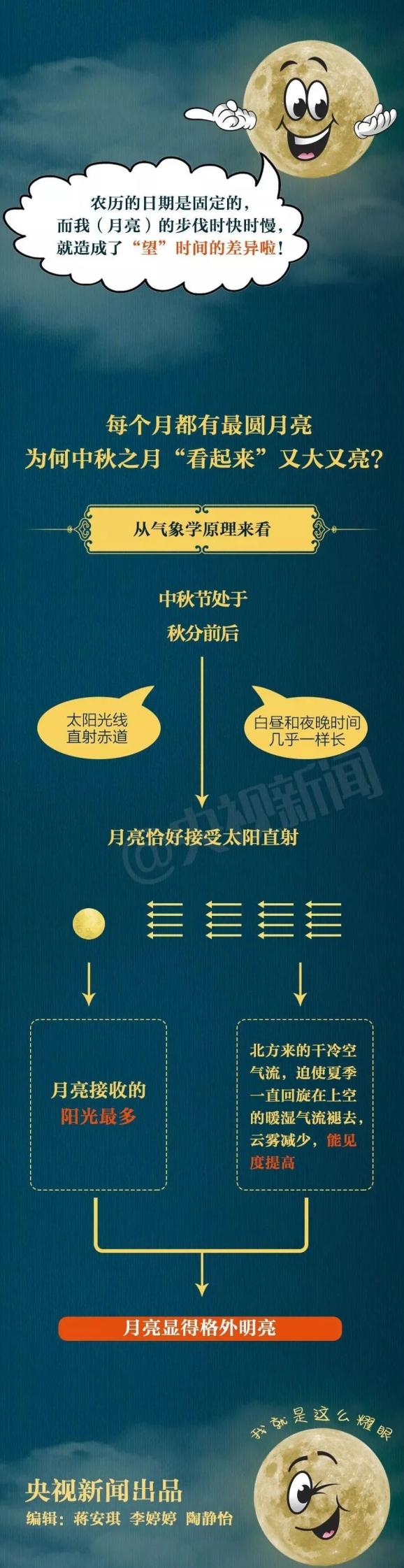 从气象学原理来看——中秋节处于秋分前后,太阳光线直射赤道,白昼和夜晚时间几乎一样长,月亮恰好接受太阳直射,北方来的干冷空气流,迫使夏季一直回旋在上空的暖湿气流退去,云雾减少,能见度提高,月亮接收的阳光最多,显得格外明亮。