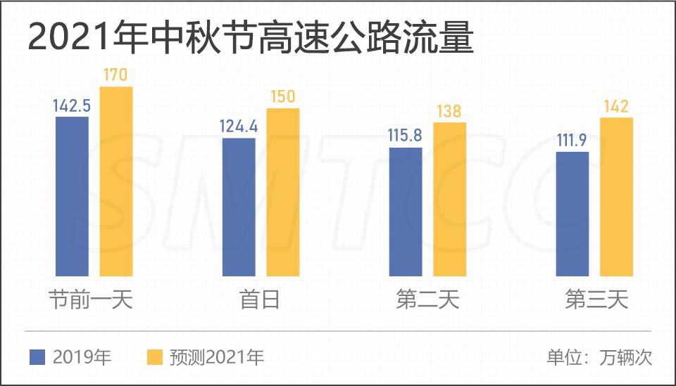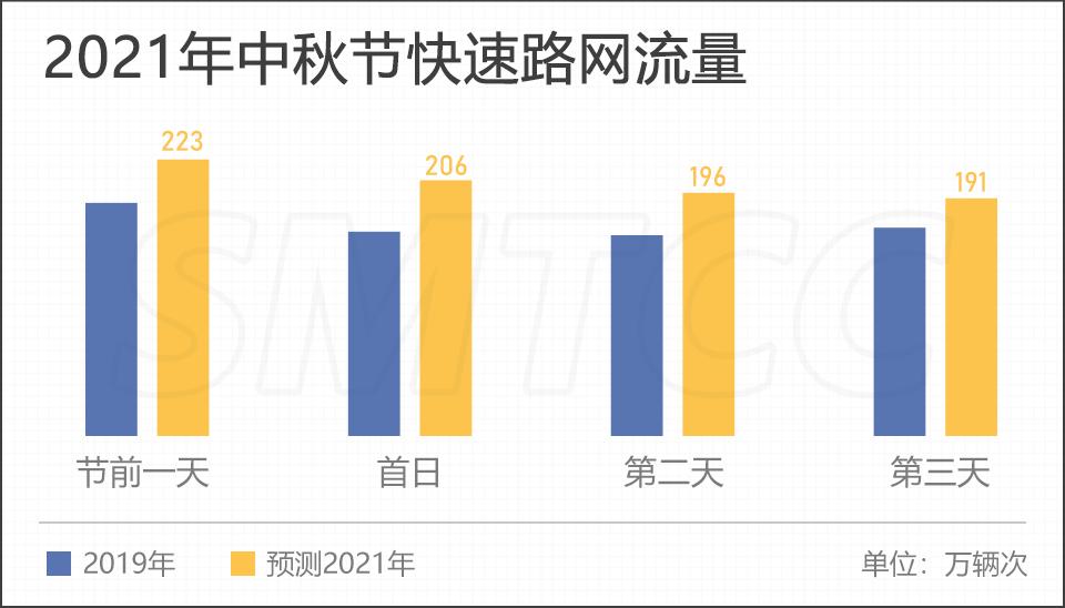 快速路预计2021年中秋节快速路网车流总体规模达到594万辆次,日均198万辆次,较2019年同期上升20%。