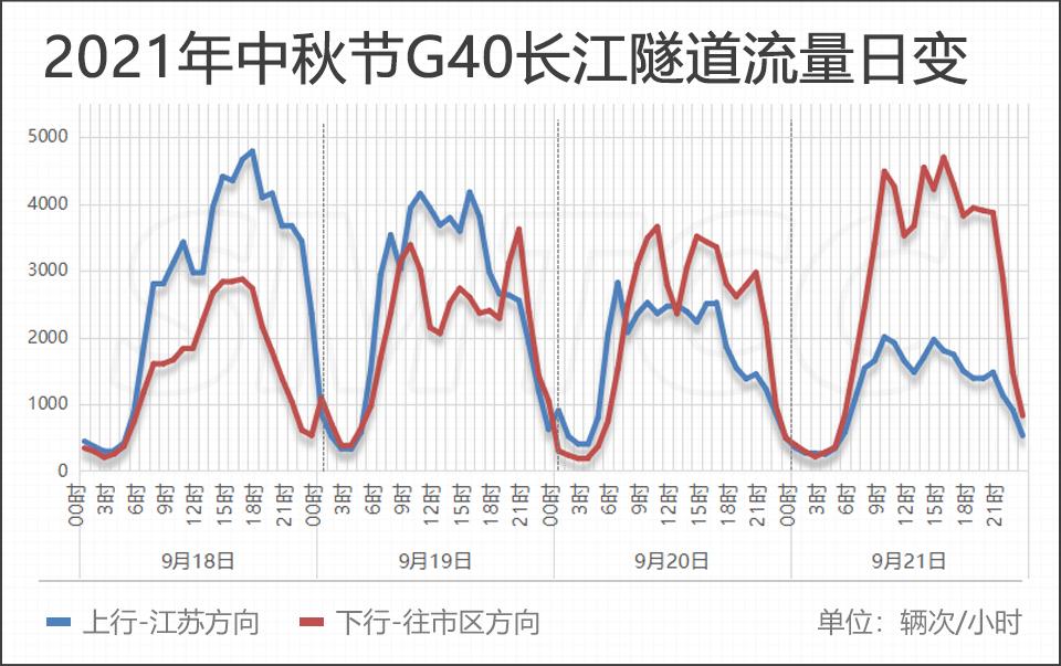 G40长江隧道:预计今日长江隧道流量以上行(江苏方向)为主,出行高峰出现在9时至16时。节日最后一天长江隧道流量以下行(市区方向)为主,高峰出现在下午13至17时,建议大家错峰出行。