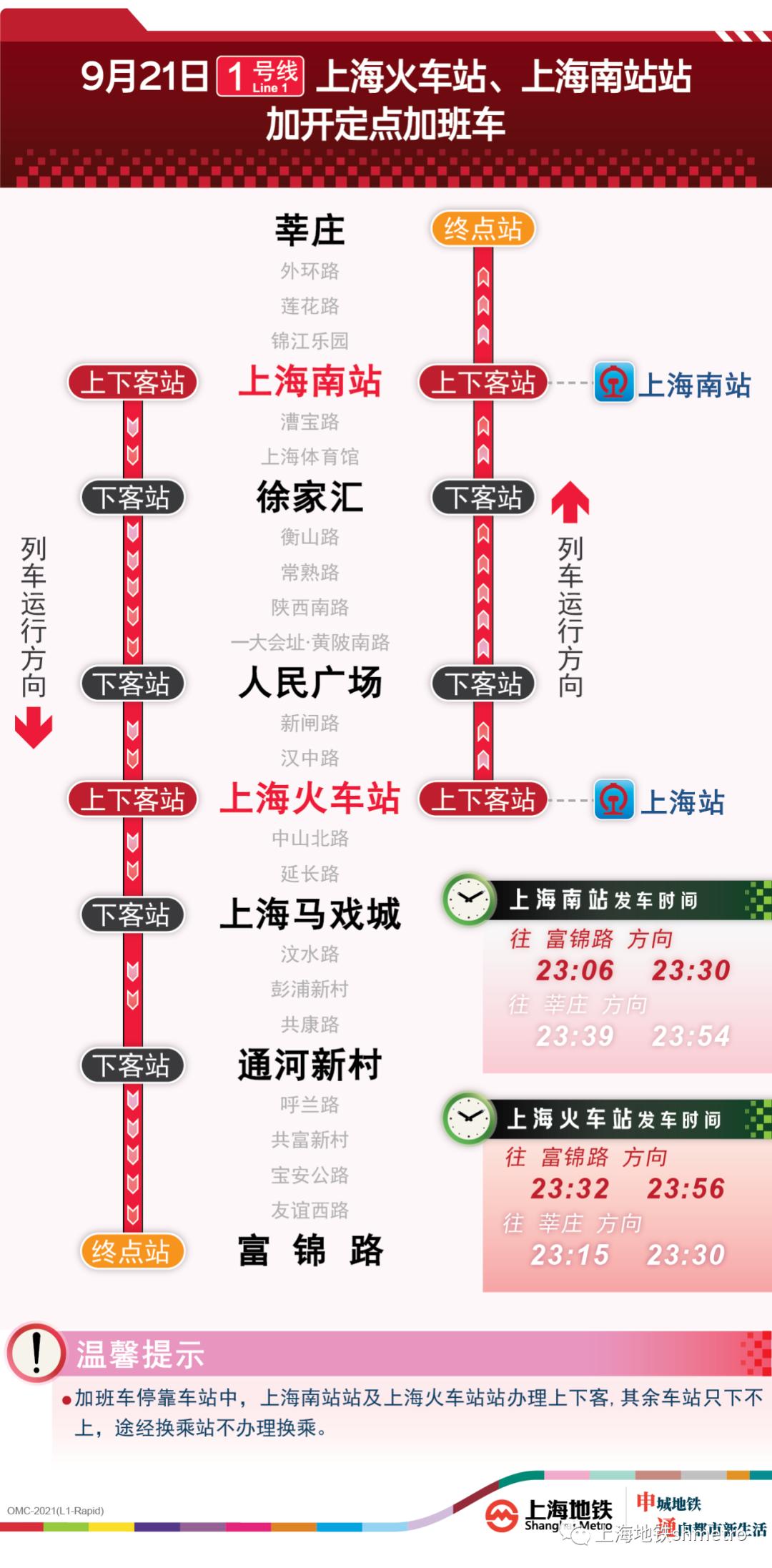 上海南站站往富锦路站方向定点加班车沿途仅停靠徐家汇站、人民广场站、上海火车站站、上海马戏城站、通河新村站、富锦路站,其余车站跳停。停靠车站中,上海南站站、上海火车站站可上下客,其余各停靠站都只能下客,途经换乘站不可换乘。