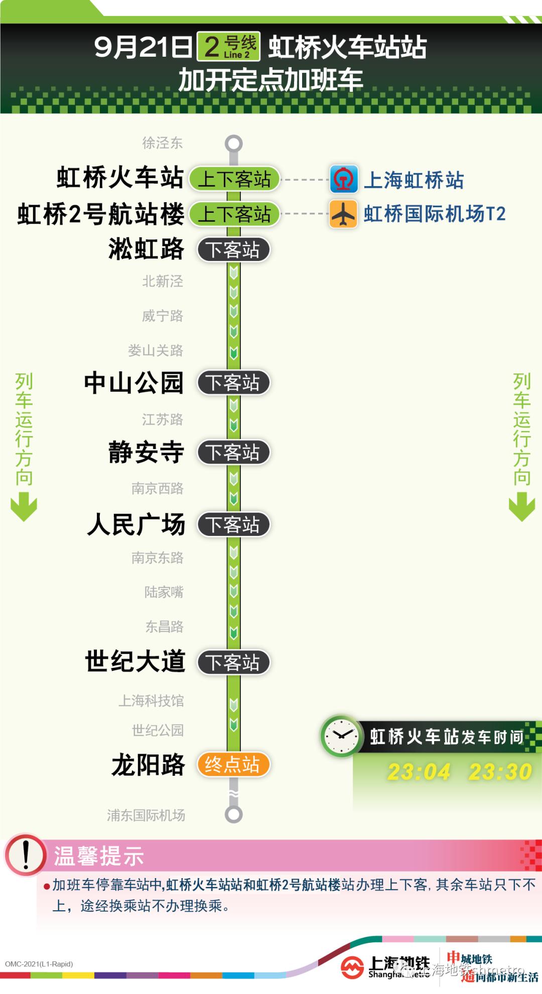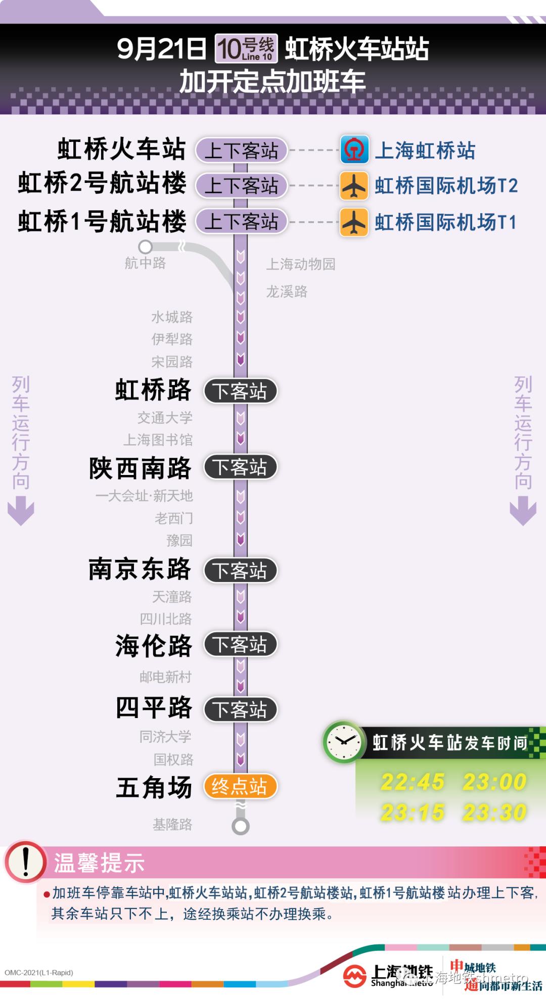10号线虹桥火车站站往五角场站方向定点加班车,沿途仅停靠虹桥火车站站、虹桥2号航站楼站、虹桥1号航站楼站、虹桥路站、陕西南路站、南京东路站、海伦路站、四平路站、五角场站,其余车站跳停。停靠车站中,虹桥火车站站,虹桥2号航站楼站、虹桥1号航站楼站可上下客,其余各停靠站都只能下客,途经换乘站不可换乘。