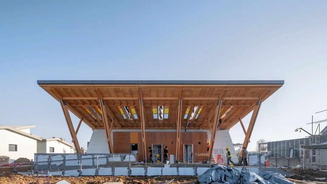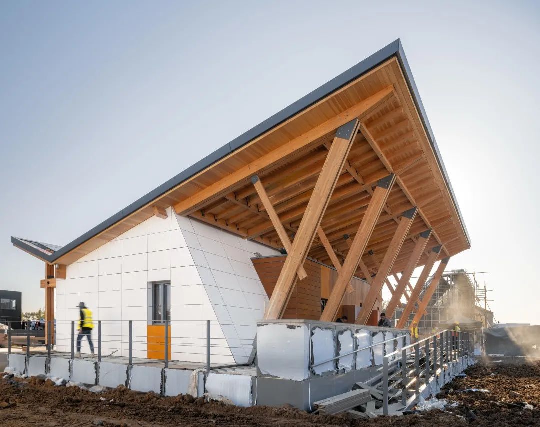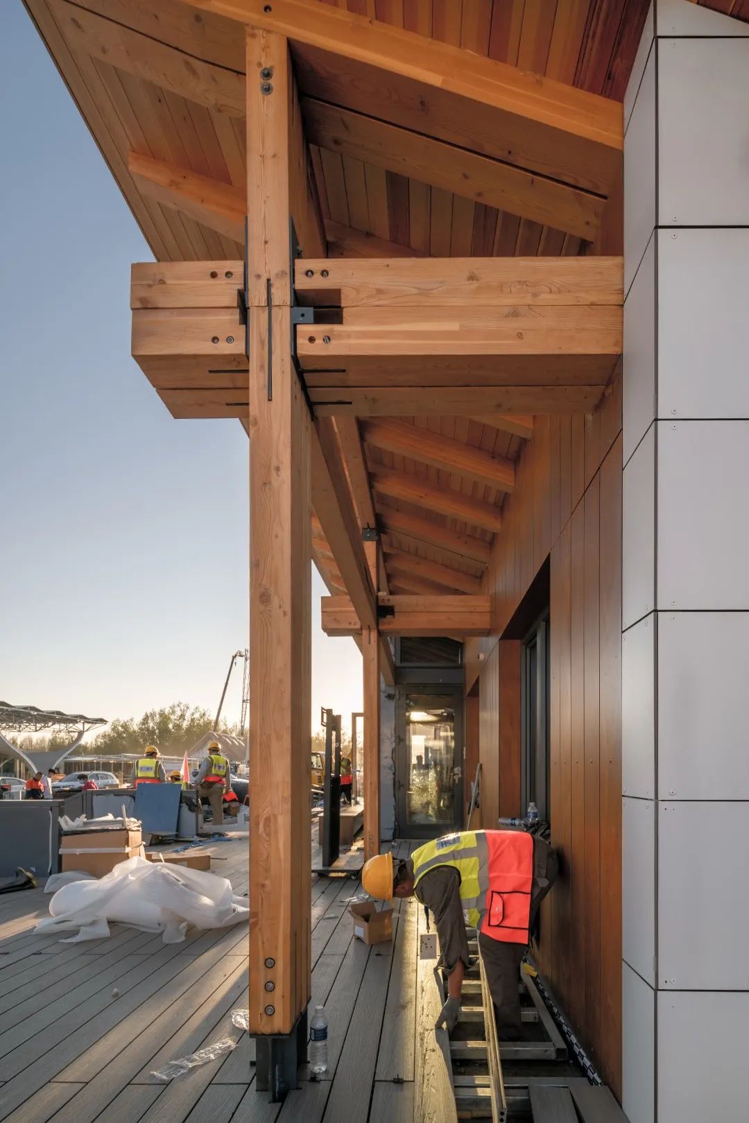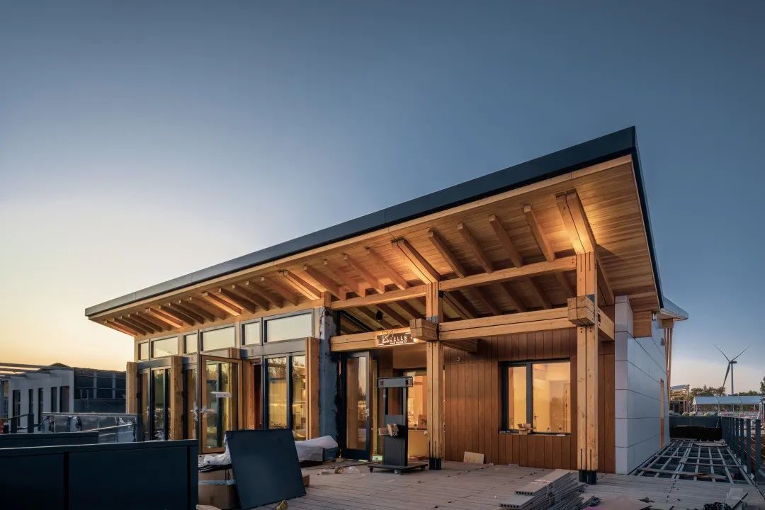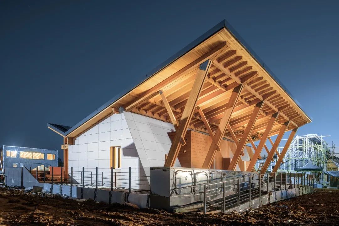 夜景充满设计感的外观与外部选用的颜色相辅相成,建筑到了夜晚会开启暖色灯光,灯光照在木质材料上给人一种温暖的感觉。