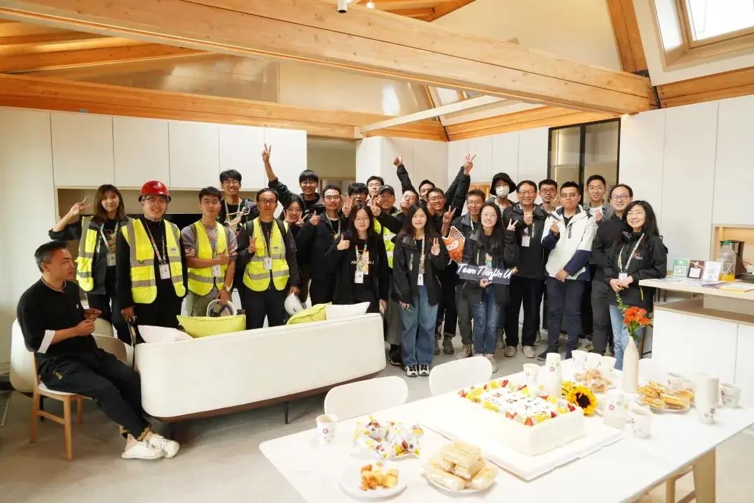 在验收后,团队于11时举办了落成仪式,并邀请到了其他赛队代表共同分享喜悦,拍摄合照记录重要时刻。写有落成日期的纪念蛋糕在老师同学们的欢呼下登场,杨崴老师作为代表致辞,感谢大家的辛苦付出。