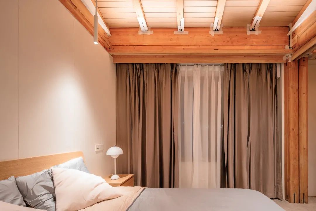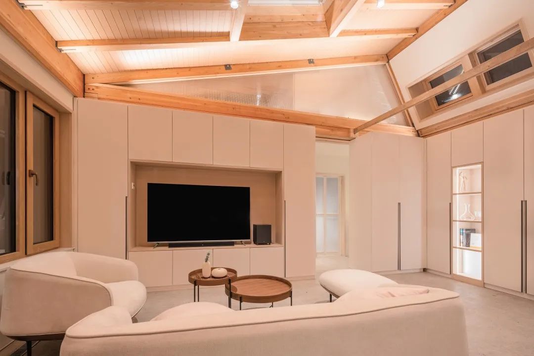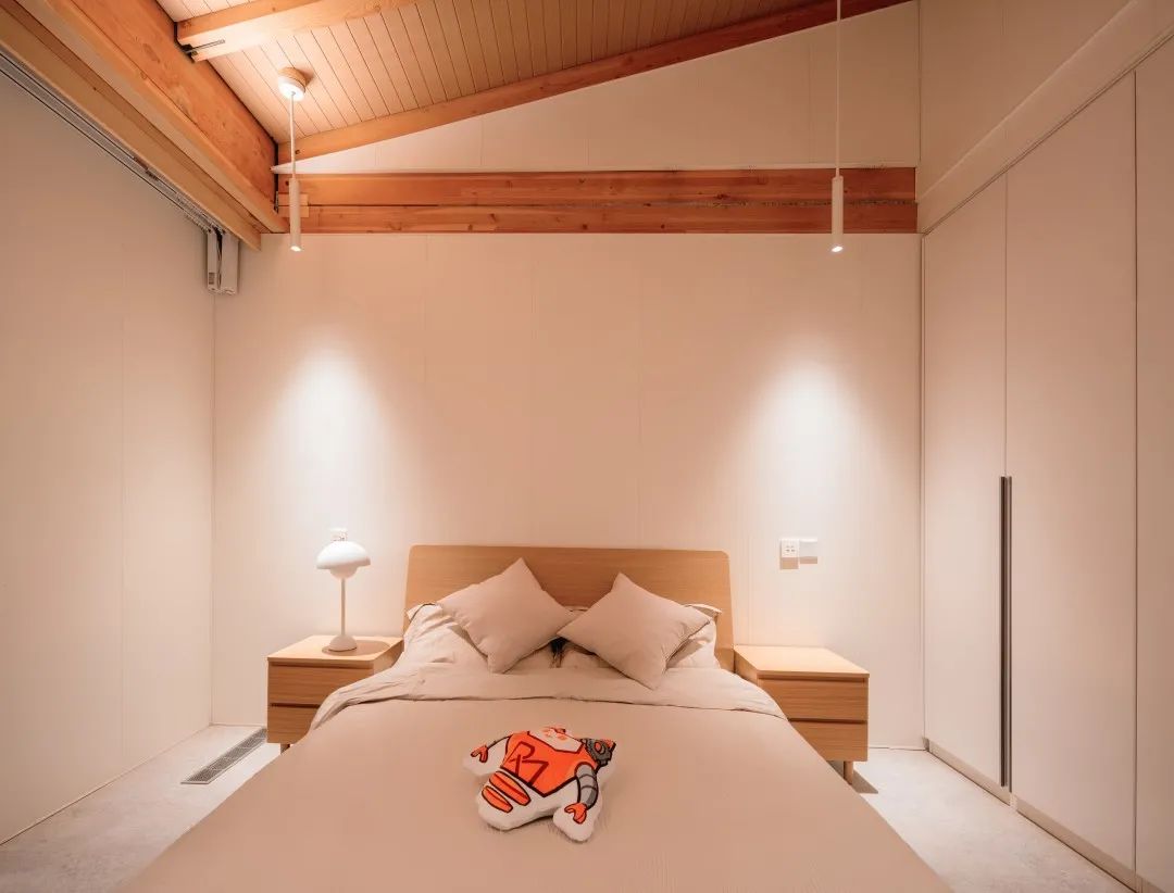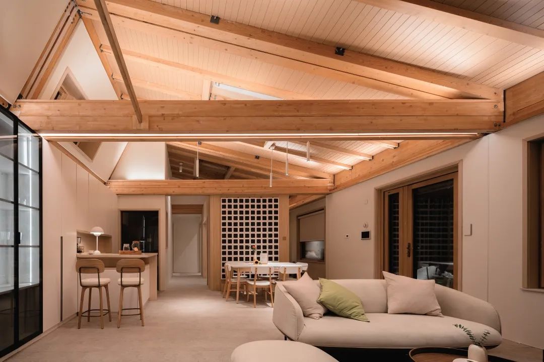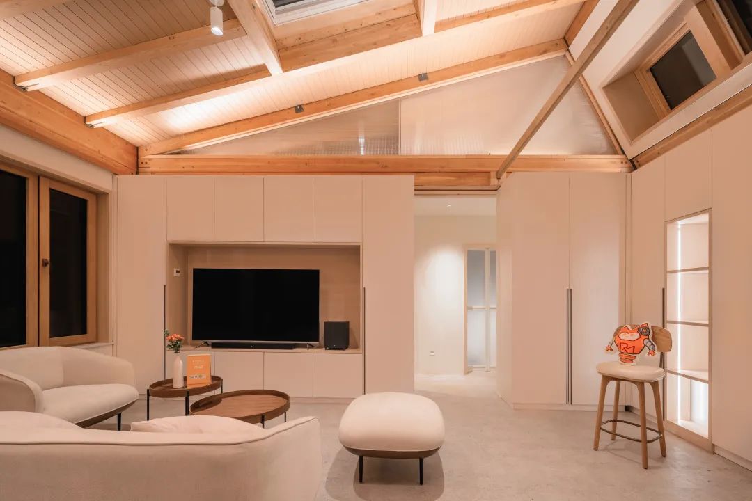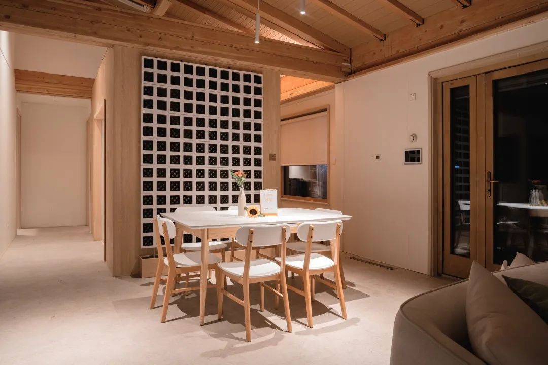 建筑内景采用暖色灯光,地面的浅灰色、墙壁的白色、木头的颜色共同构成了一种温馨的氛围。建筑内部的低饱和度颜色和简约的设计能够给人一种舒适安逸的生活环境。