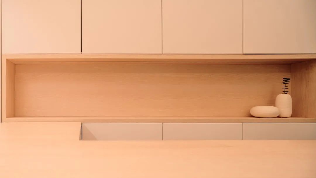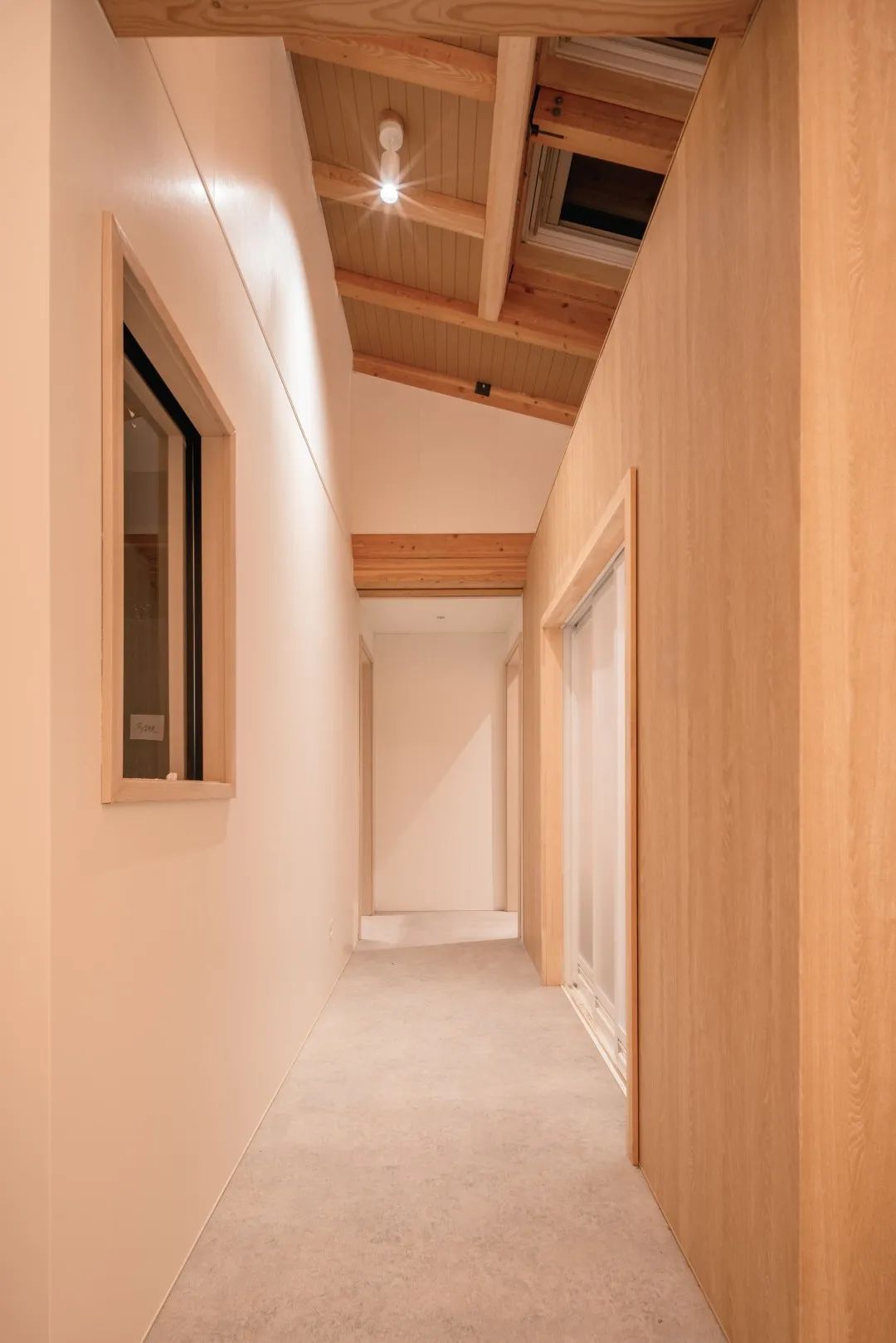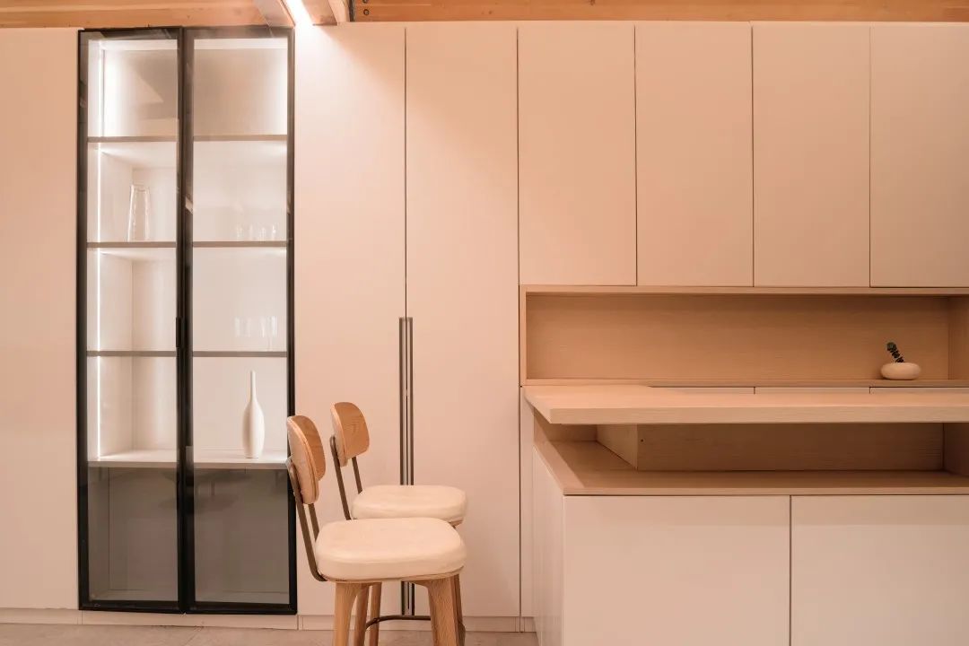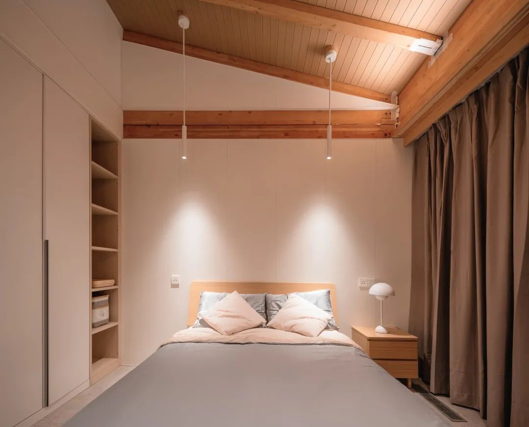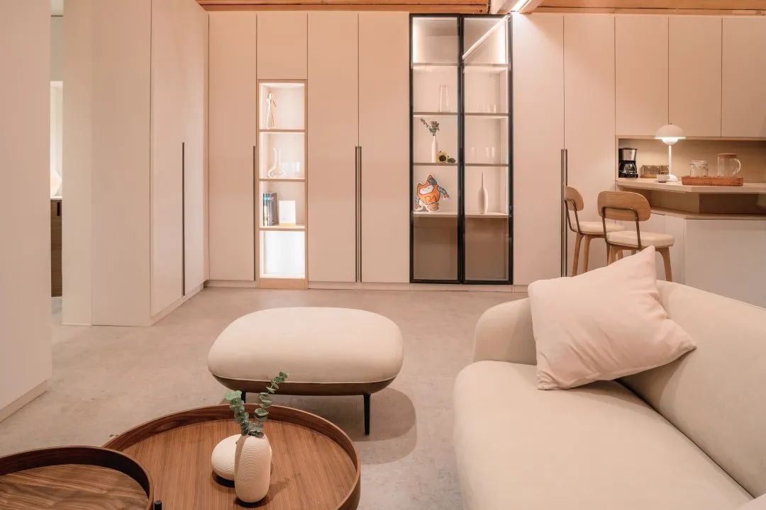 建筑内景采用暖色灯光,地面的浅灰色、墙壁的白色、木头的颜色共同构成了一种温馨的氛围。建筑内部的低饱和度颜色和简约的设计能够给人一种舒适安逸的生活环境。