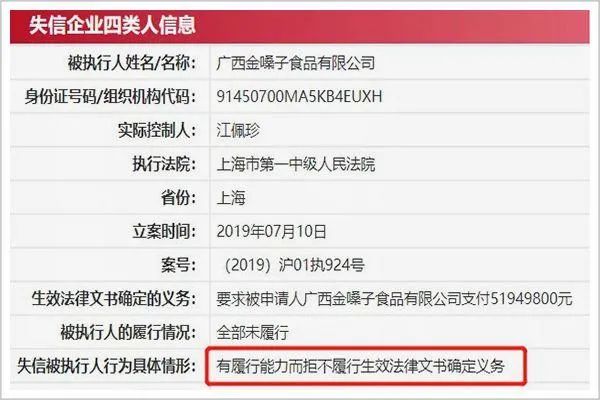 然而,因不认可这两档节目的广告数据,金嗓子迟迟不肯交付全部广告费。2019年11月,上海市高级人民法院判决金嗓子旗下食品公司支付代理商星空华文5100多万元广告费。由于金嗓子食品拒不执行,被列入了失信执行人名单,江佩珍也被限制消费,限制出境。