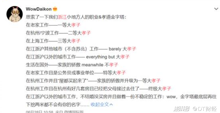 要知道,根据微博上特别火的“浙江孝子标准图”,哪怕在极有地级市荣誉感的浙江,儿女们满足“在杭州工作有房且已经把父母接过来住”这一条件能打败“在本地当公务员的子女”,直接晋升为终极大孝子。