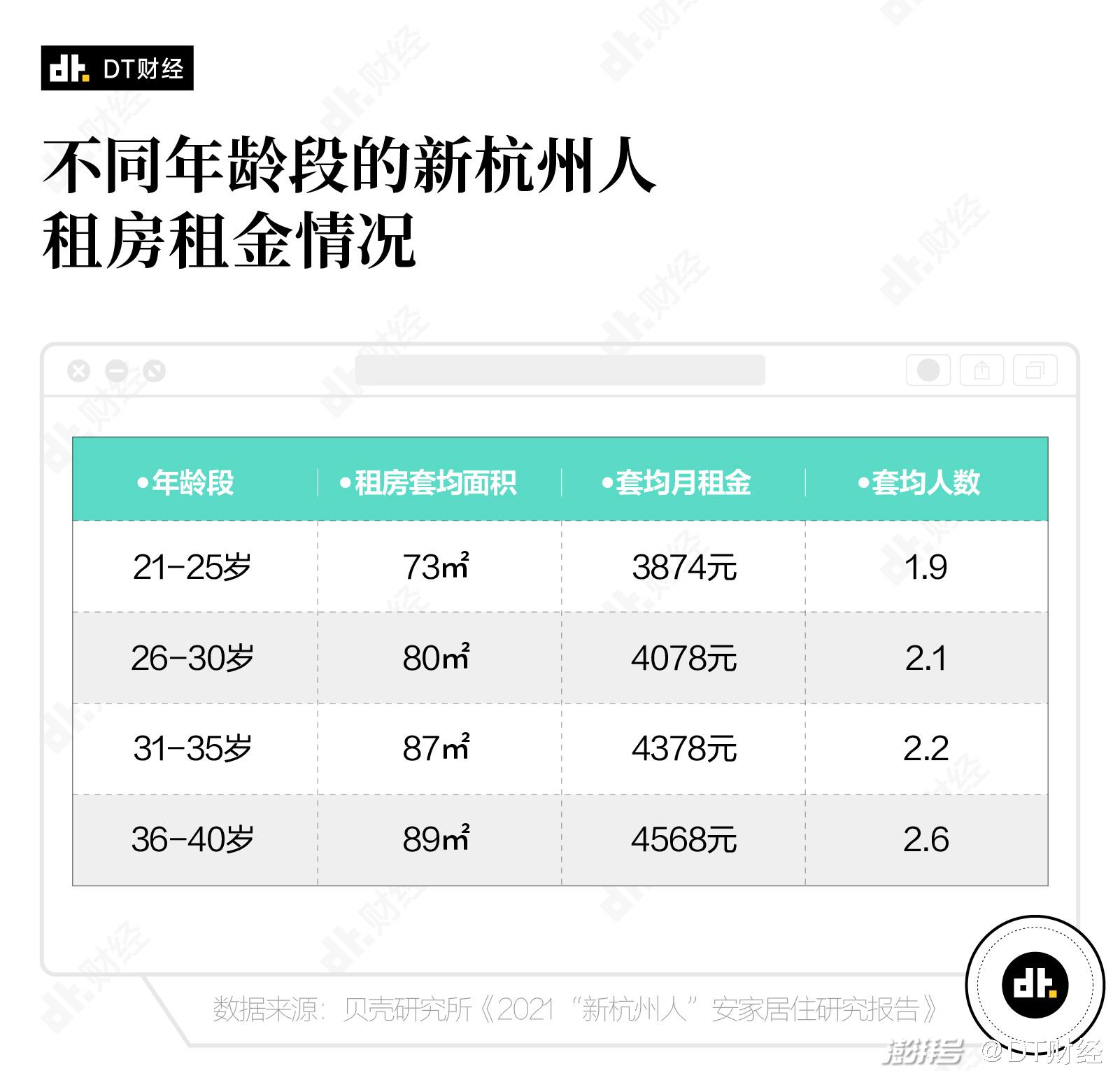 在报告里,新杭州人租房的套均租金在3800元到5000元的范围里,哪怕是刚开始工作的21到25岁的职场新人,都愿意住进套均3874元的房间里。并且新杭州人明显更偏向于2人合租的房子,从21到40岁,新杭州人每套房的套均人数都没有超过3人。