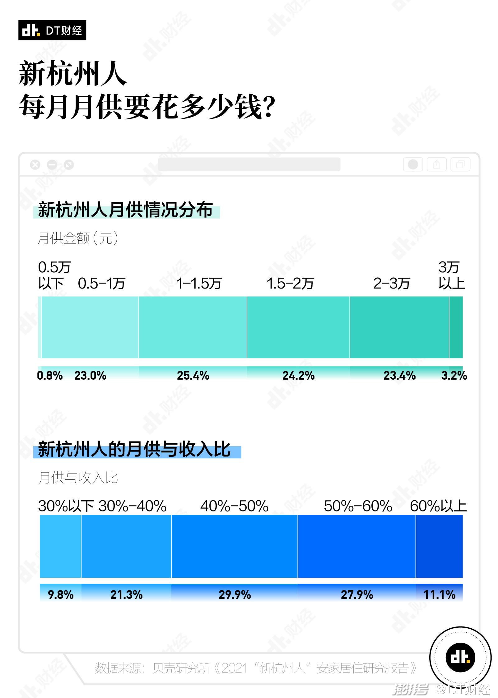 根据《安家报告》,近三成新杭州人购房者月供占比收入40%- 50%,月供占比50%-60%紧随其后,达27.9%。也就是说,有近6成的年轻人每个月光是付房贷就得掏出40%-60%的薪水。也难怪不少人说买了房之后,自己的生活水平直线下降。
