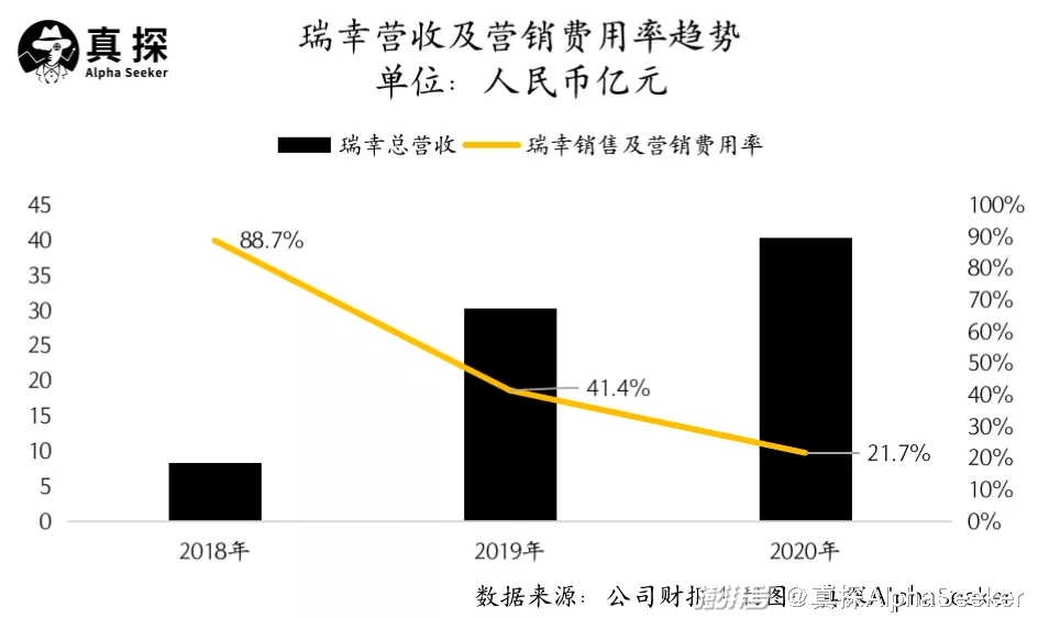 再看支出端,瑞幸2020年的销售及营销费用为8.8亿元,占总营收的比例为21.7%,远低于2018年的88.7%和2019年的41.4%。年报显示,2020年5月后,公司降低了产品的整体折扣水平,并终止了产品免费促销活动。