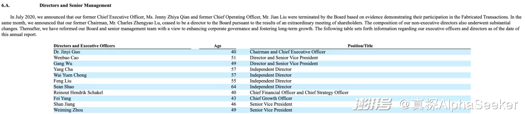 造假丑闻爆发后,瑞幸迎来董事会和高管团队大换血。在年报中,瑞幸咖啡原董事长陆正耀、原CEO钱治亚、原COO刘健均已从公司高层名单消失。瑞幸现任董事长兼CEO为郭谨一,首席增长官杨飞、高级副总裁周伟明、高级副总裁曹文宝分别是公司营销、产品、门店运营领域的核心人物。
