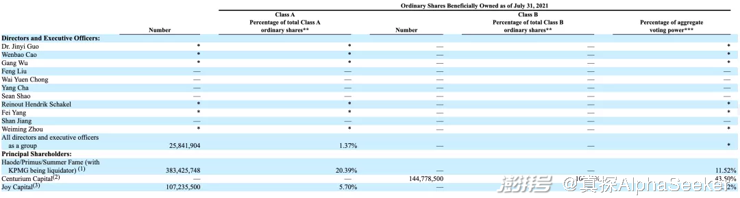 瑞幸高层所获股权激励情况,图源:瑞幸2020年年报而在公司股权结构层面,瑞幸也已改弦更张。根据年报,截止2021年7月31日,瑞幸咖啡总股本为18.8亿A类股和1.45亿B类股,大钲资本持有全部B类股,由于B类股拥有超级投票权,大钲资本拥有瑞幸43.50%的投票权。愉悦资本则持有5.7%的A类股、投票权为3.22%。