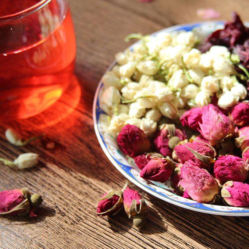 在钱椿年、顾元庆的他们合著的《茶谱》里记载:“木樨、茉莉、玫瑰、蔷薇、兰蕙、橘花、栀子、木香、梅花皆可作茶。诸花开时,摘其半含半放,蕊之香气全者,量其茶叶多少,摘花为茶。”