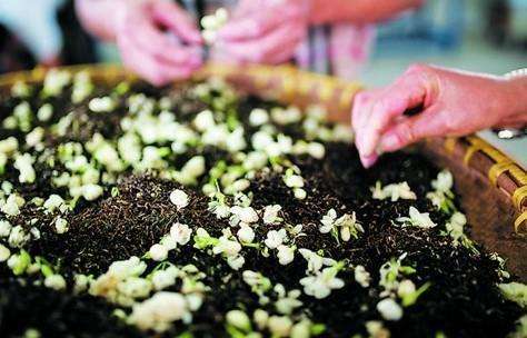 到了明代又发明了“隔花窨茶”。明代皇室成员朱权在《茶谱》中言简意赅地记了一笔:“今人以果品为换茶,莫若梅、桂、茉莉三花最佳,可将蓓蕾数枚投入瓯内罨之,少顷,其花自开,瓯未至唇,香气盈鼻矣。”