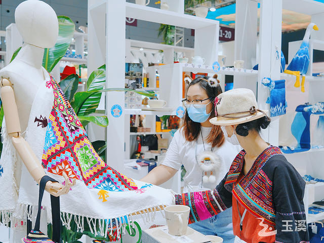 “这个披肩不仅融入了民族元素,它的花型与脉络走向偏流行一些,一针一线都是我亲手绣缝制,您可以上身试试。”9月24日,在第十七届中国(深圳)国际文化博览交易会上,玉溪非遗刺绣“小龙茵”创始人钱晓丽正在为来到玉溪展柜的游客介绍刺绣作品。甚至,钱晓丽头上的一顶绣花帽也被游客询价。