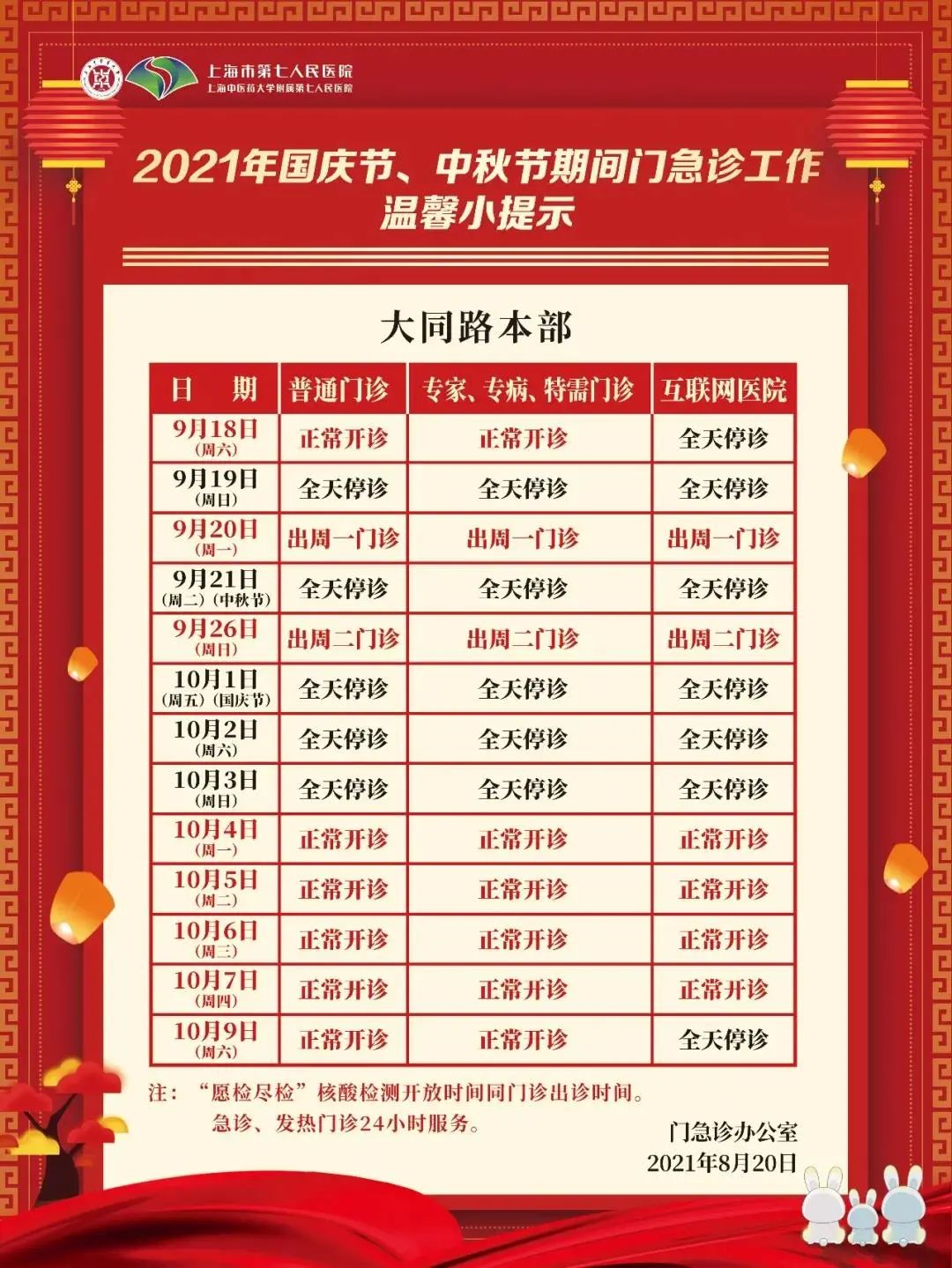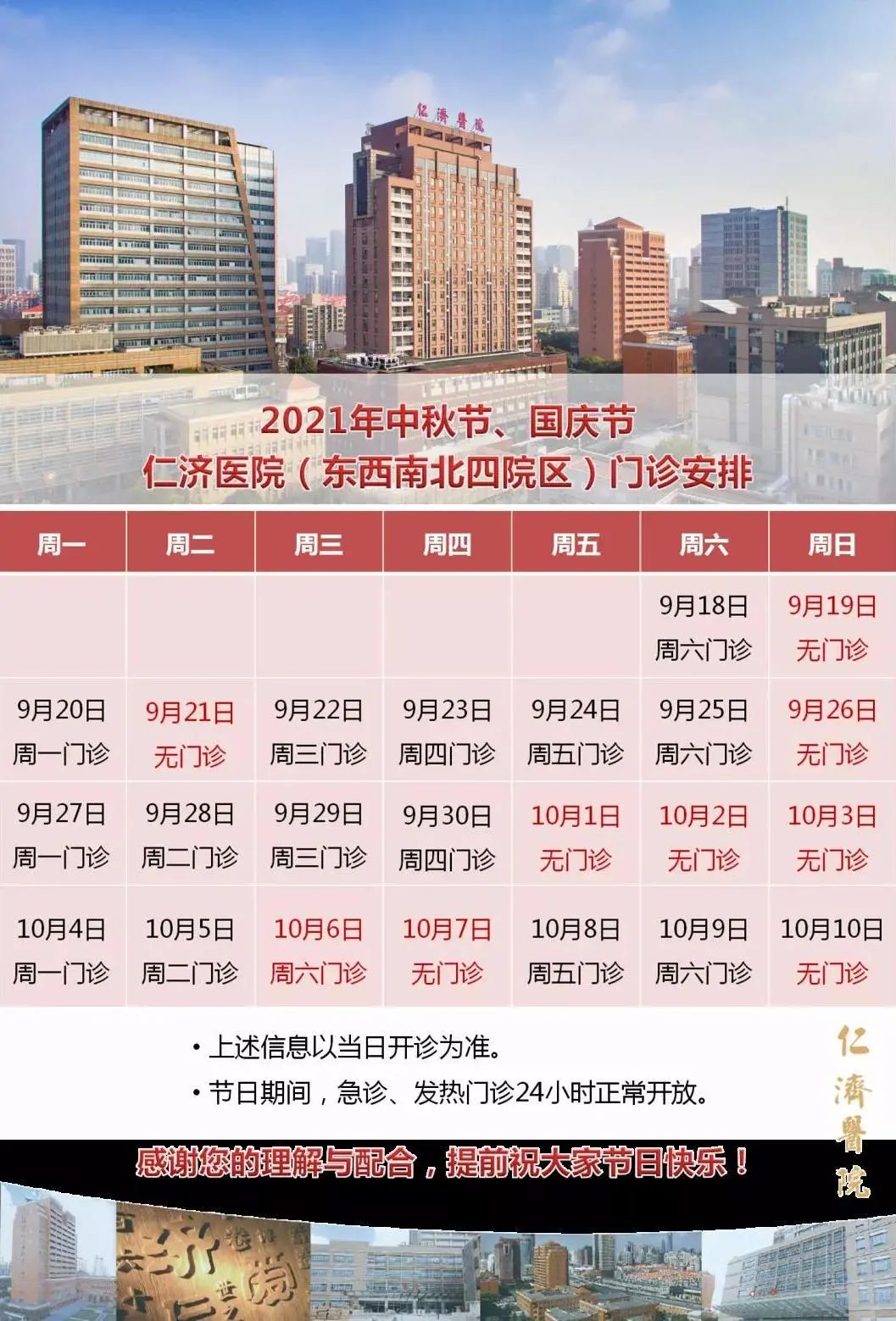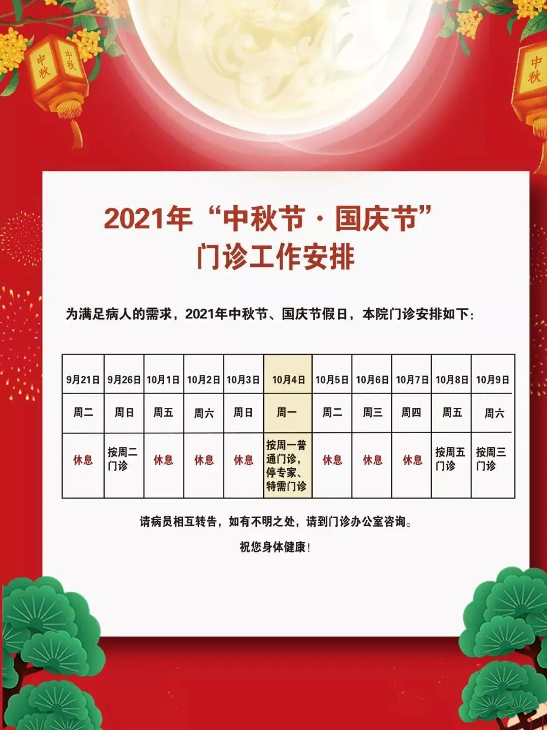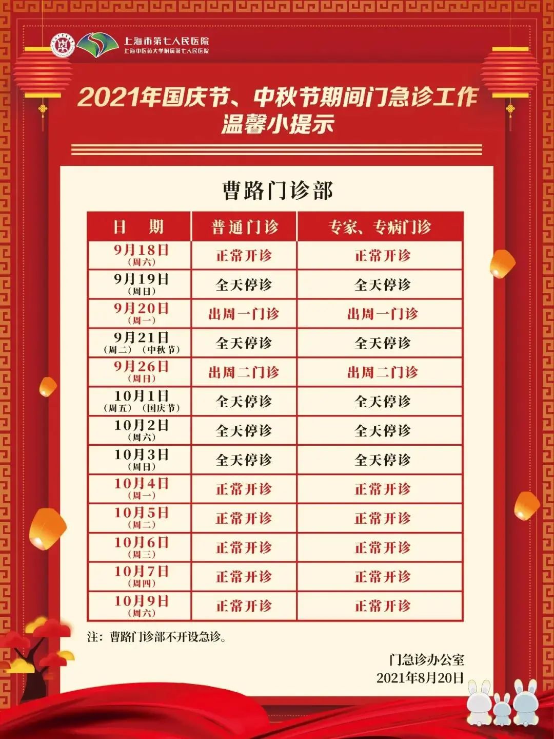 3、10月4日(周一)、10月7日(周四)普通门诊、康复门诊(上午)开放。
