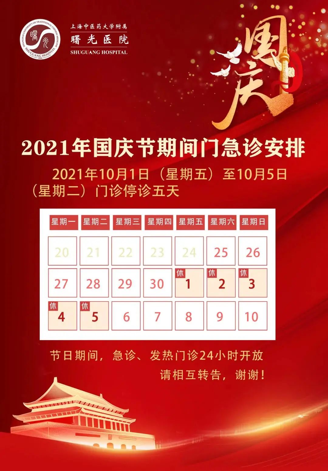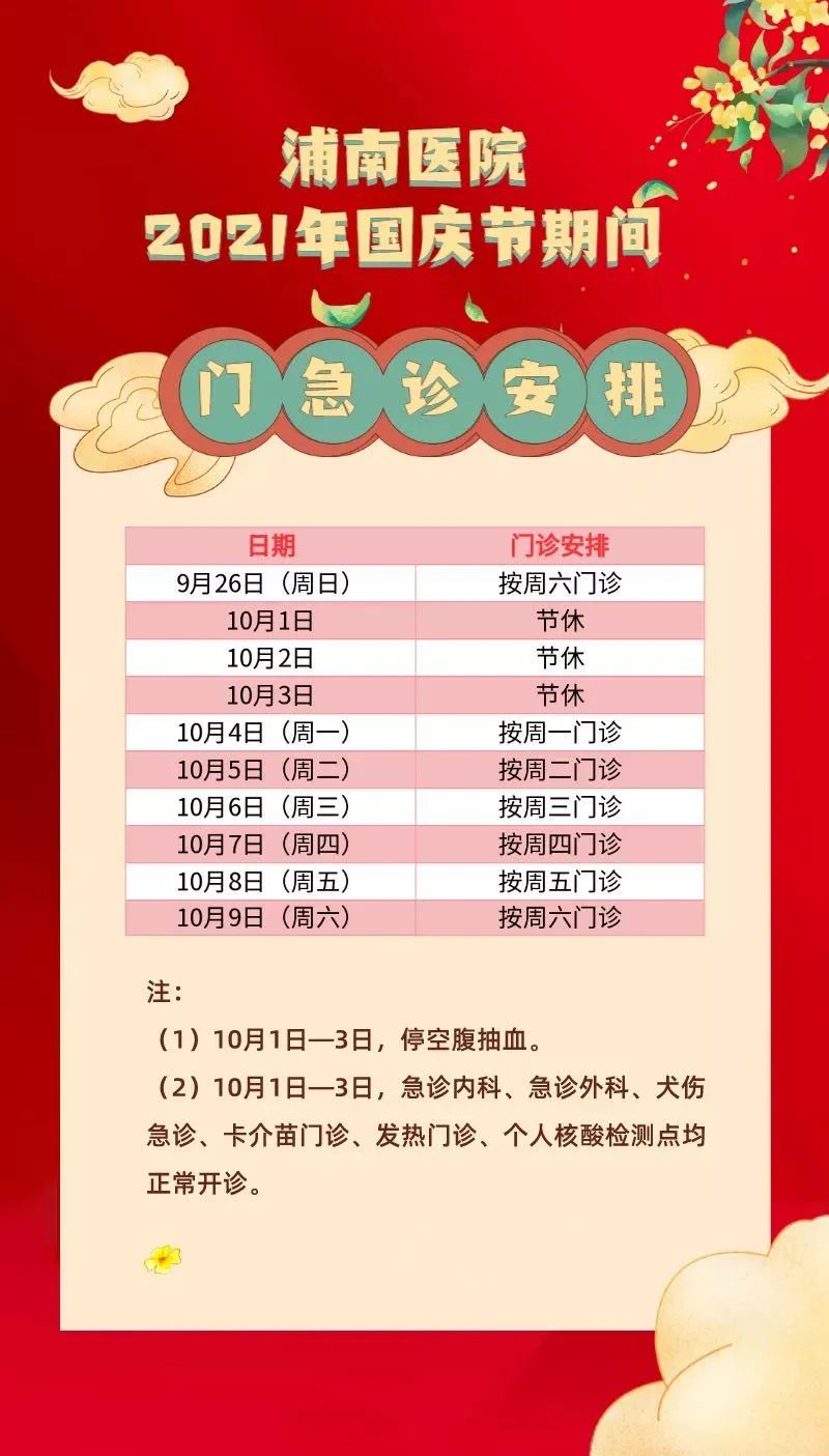 2、10月1日(周五)、10月2日(周六)、10月3日(周日)、10月5日(周二)、10月6日(周三)普通门诊开放。