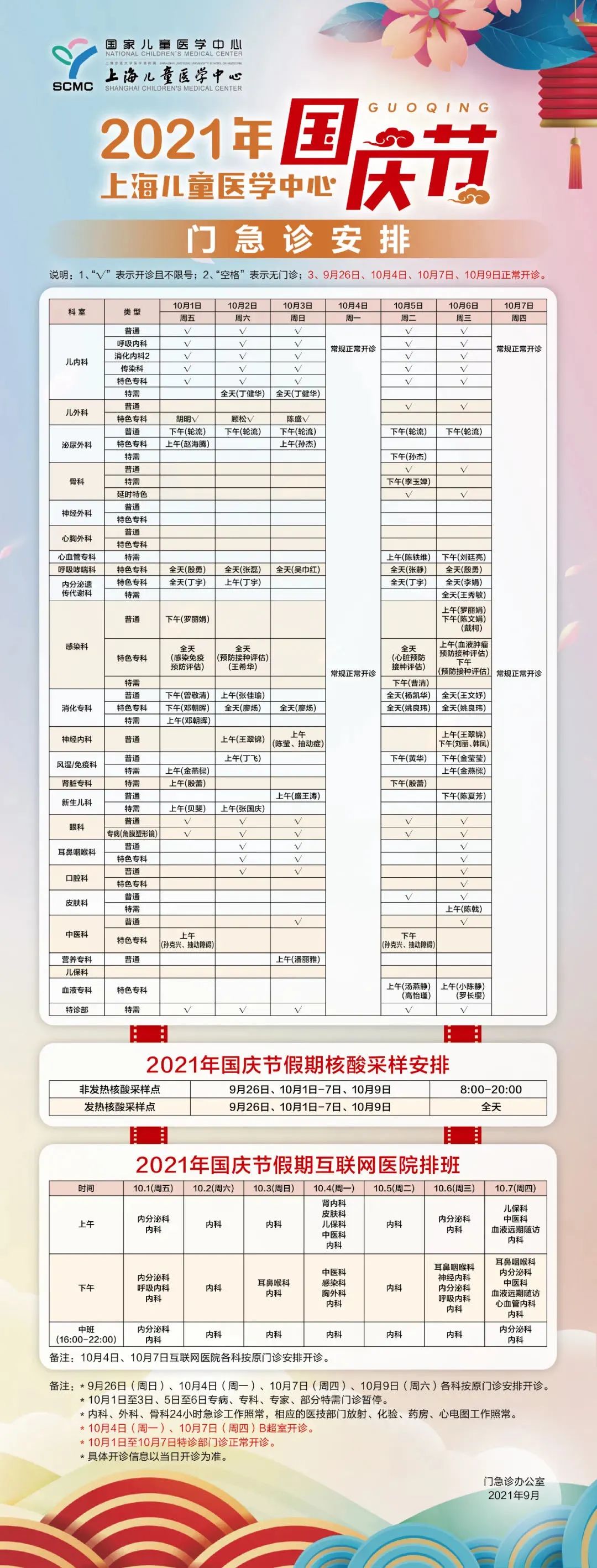 3、10月4日、5日、6日、7日开放普通门诊(部分科室有调整)。