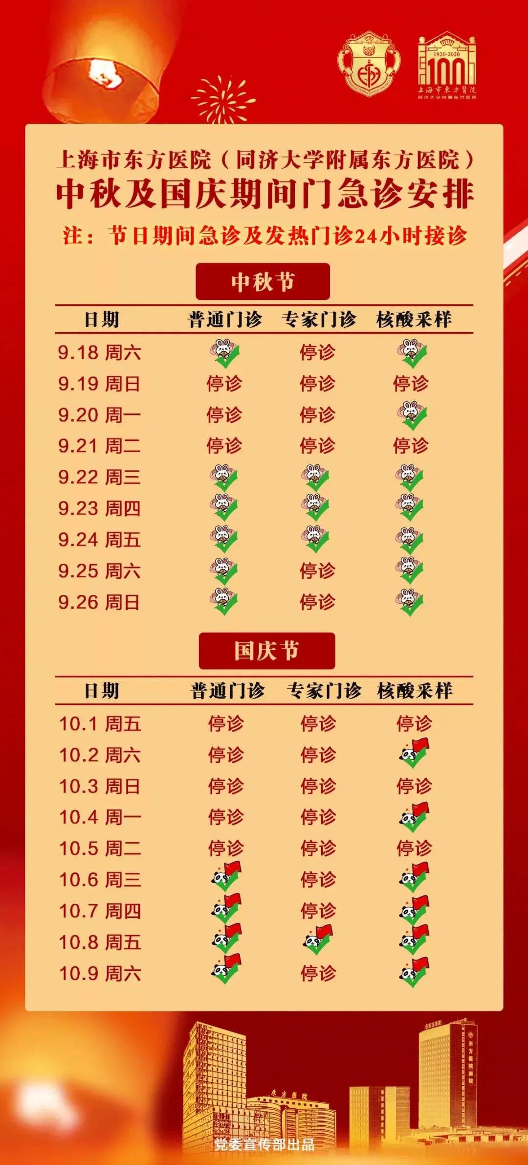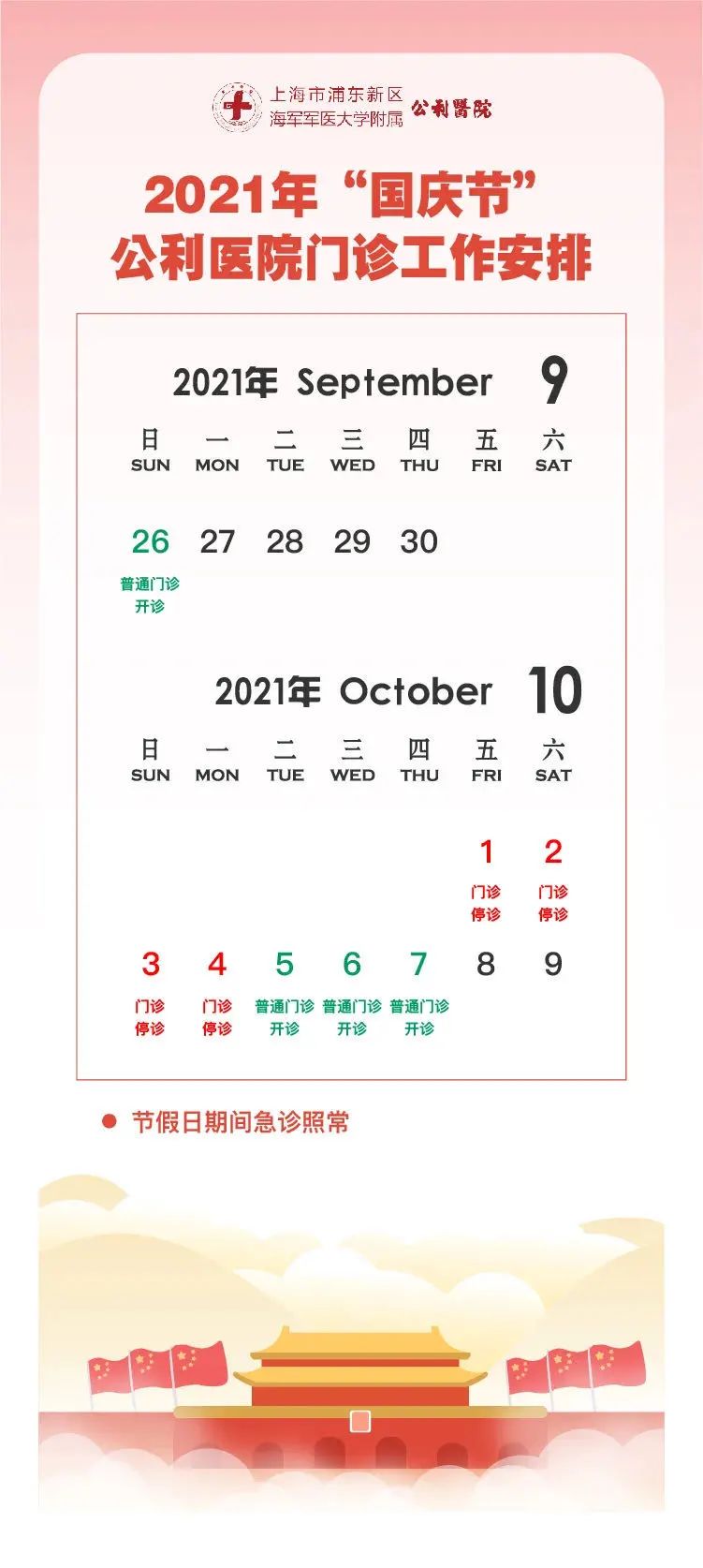 1、9月26日(周日)正常上班:普通门诊开放。