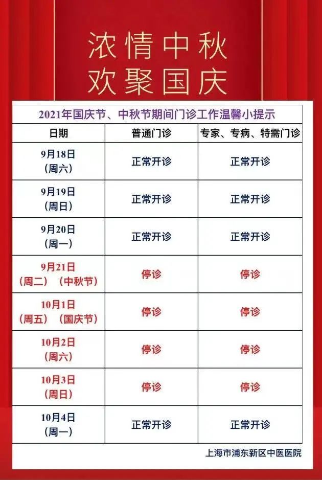2、专家门诊:10月1日-3日停诊(10月4日-7日以实际出班为准)。